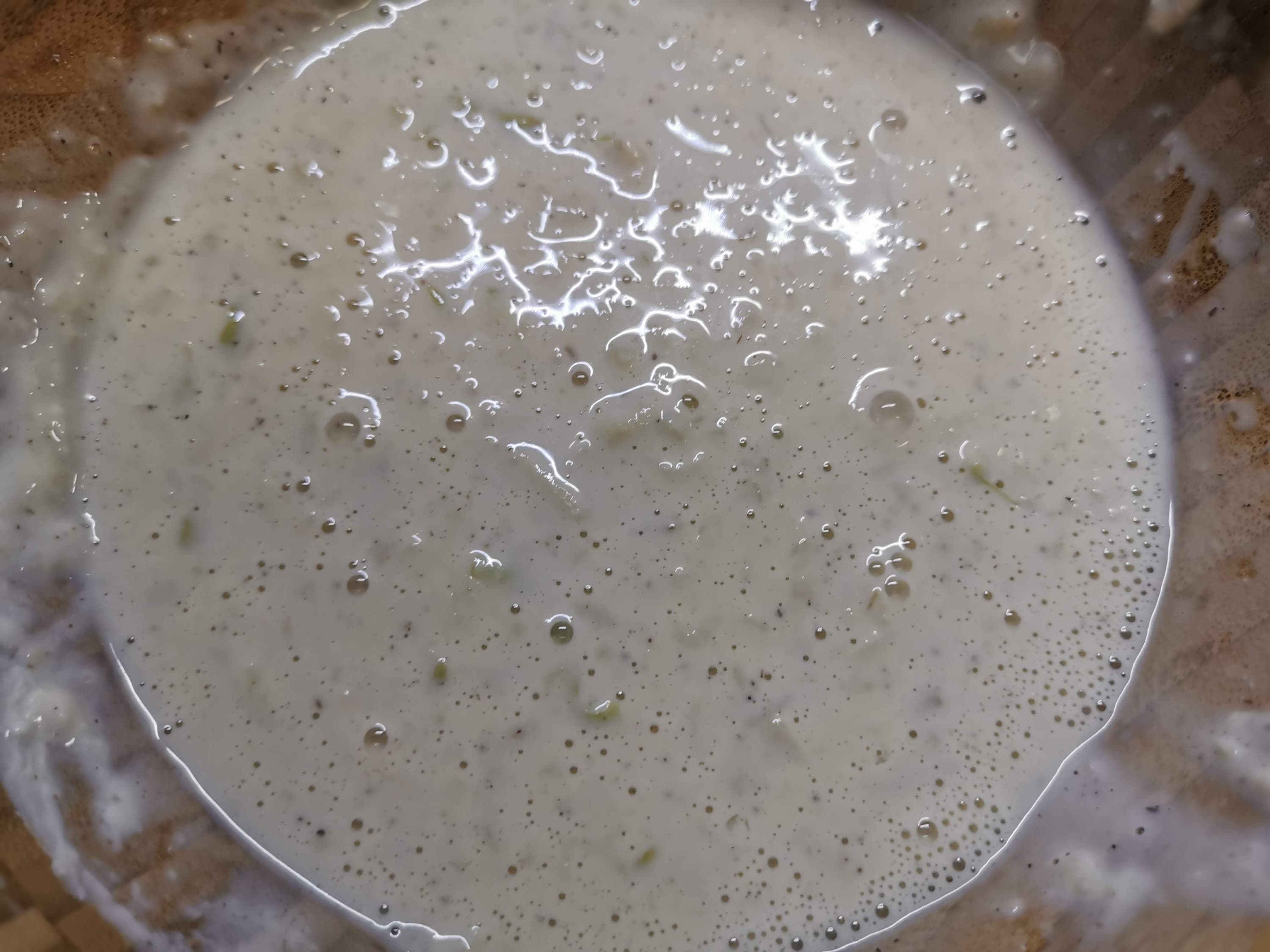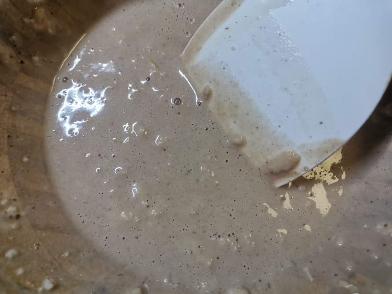 Все ингредиенты тщательно перемешали с помощью венчика. Тесто получилось жидким, но достаточно плотным.