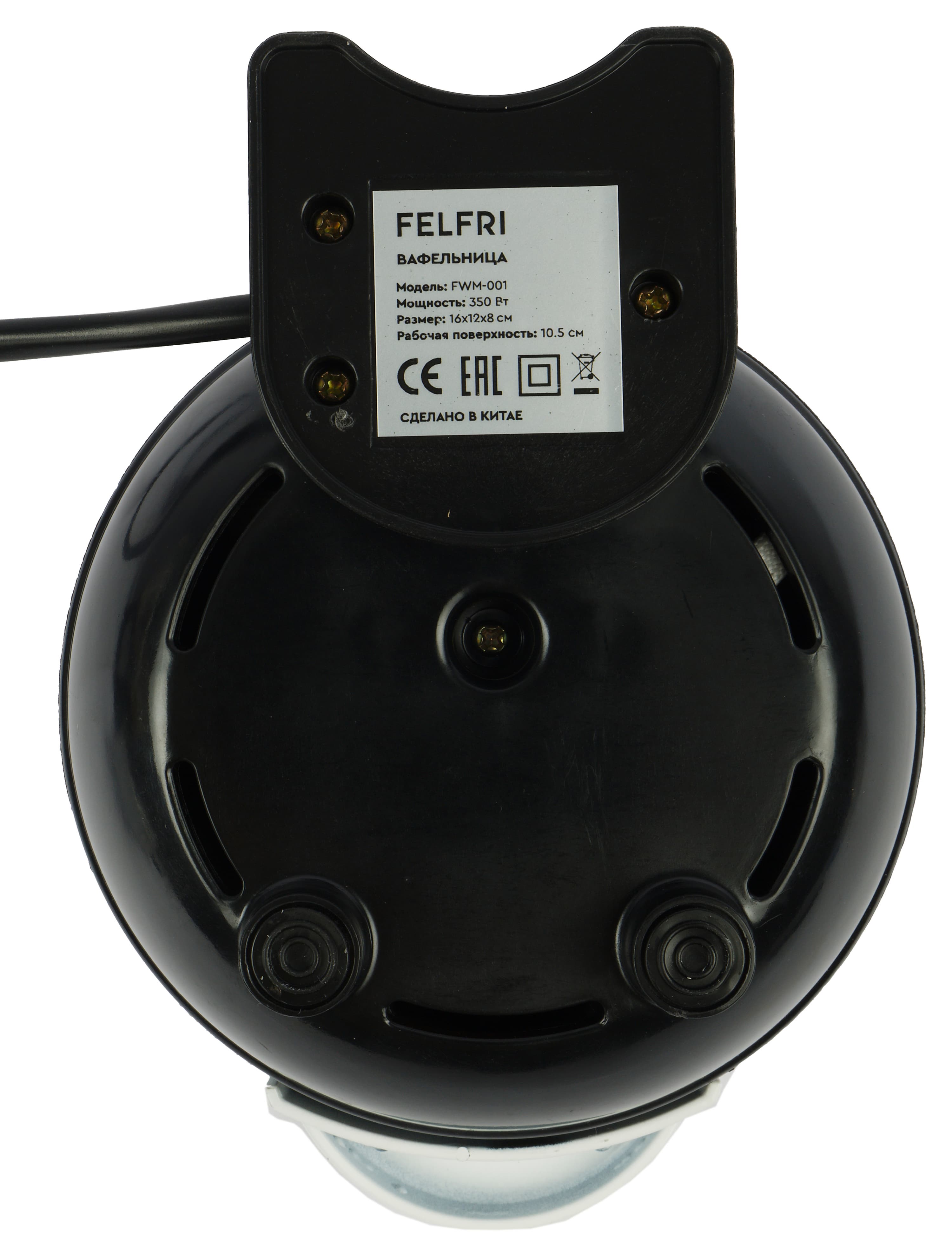 На выступе основания, который скрывает место выхода шнура из корпуса, расположен шильдик с технической информацией о вафельнице. С противоположной стороны расположены две пластиковые ножки с прорезиненными накладками.
