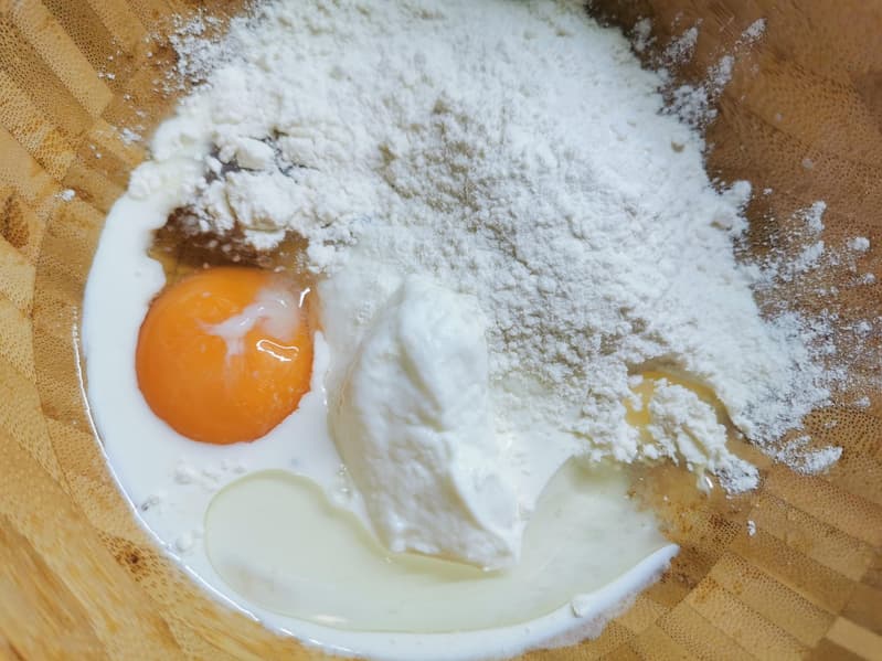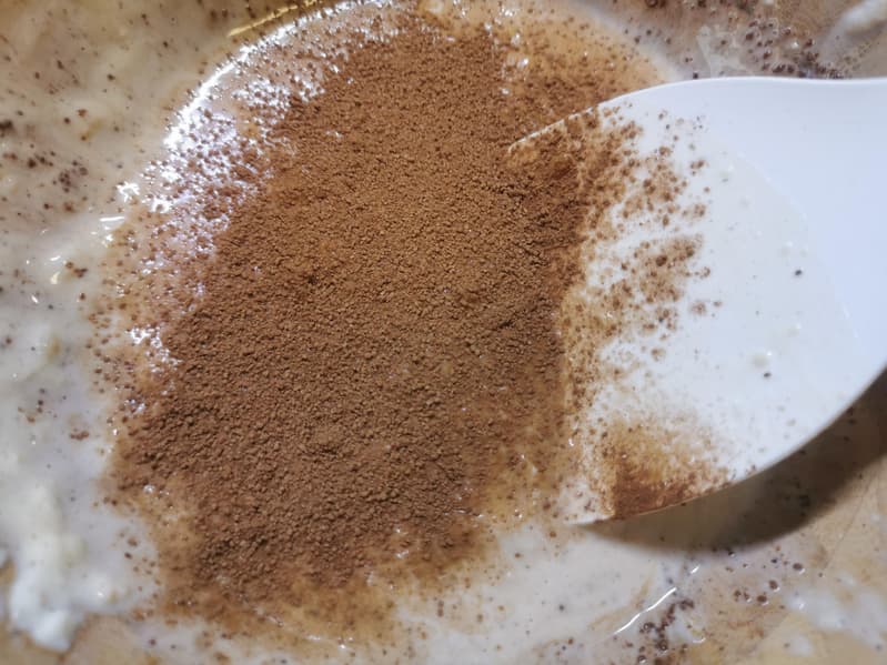 Добавили яйцо, сахар, корицу, полстакана муки, полстакана молока и разрыхлитель.