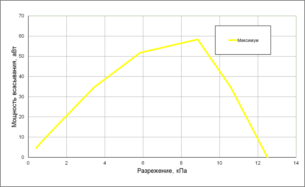 Мощность всасывания мы определяли при работе пылесоса без насадок. Зависимость мощности всасывания на единственном доступном режиме мощности от создаваемого разрежения приведена на графике ниже: