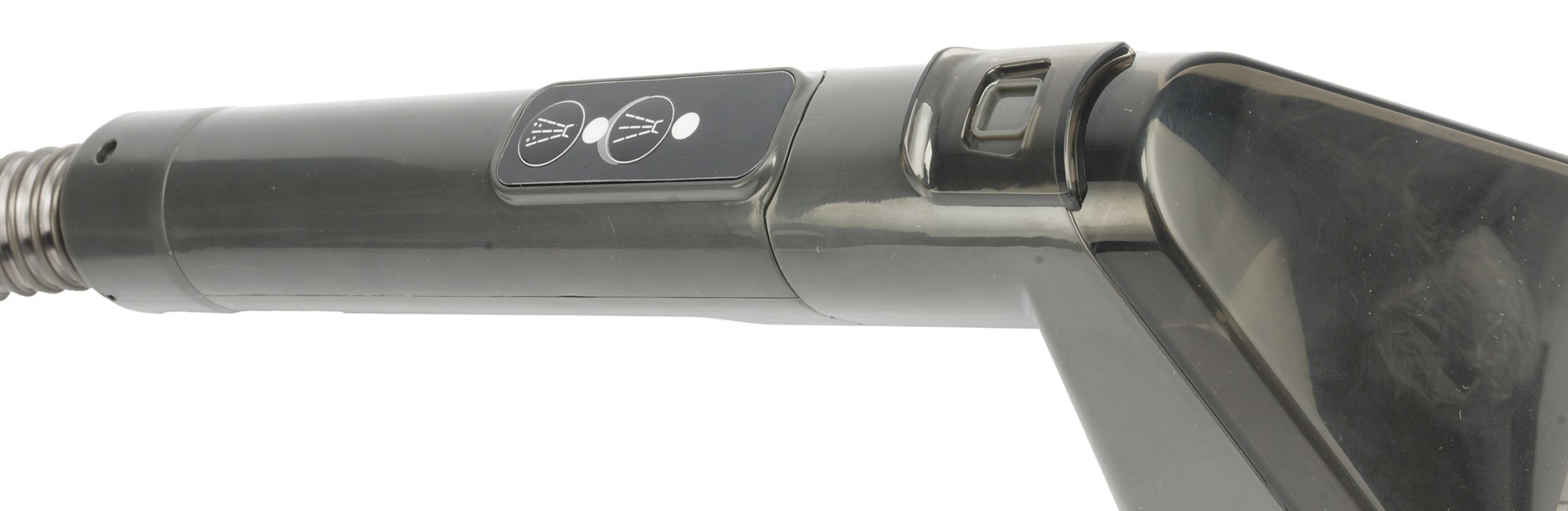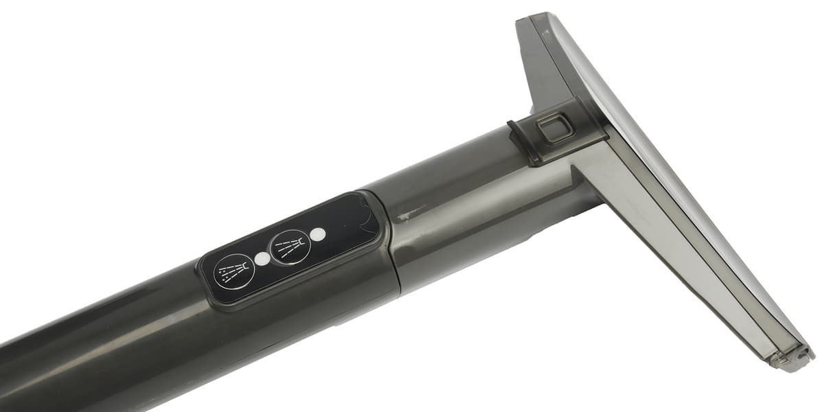 Шланг длиной 130 сантиметров, имеет несъемную 20-сантиметровую рукоятку с двумя кнопками для подачи воды и моющего средства..