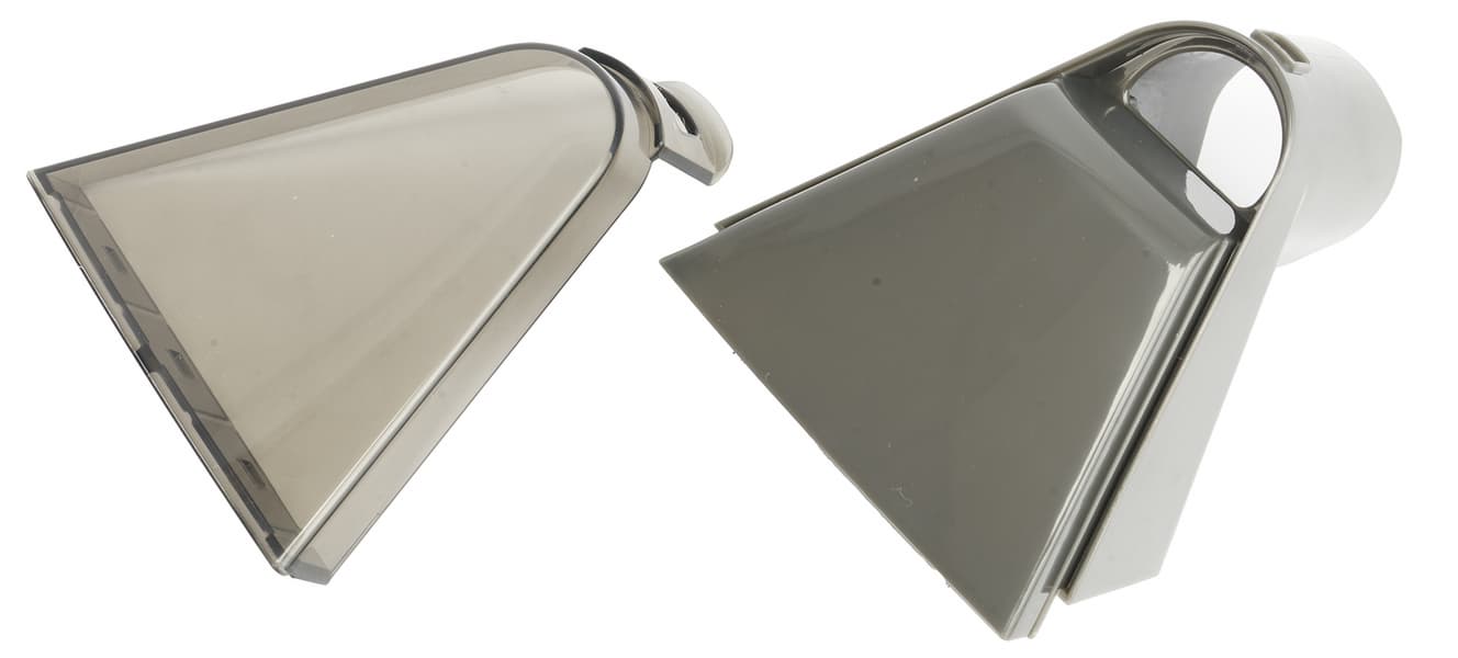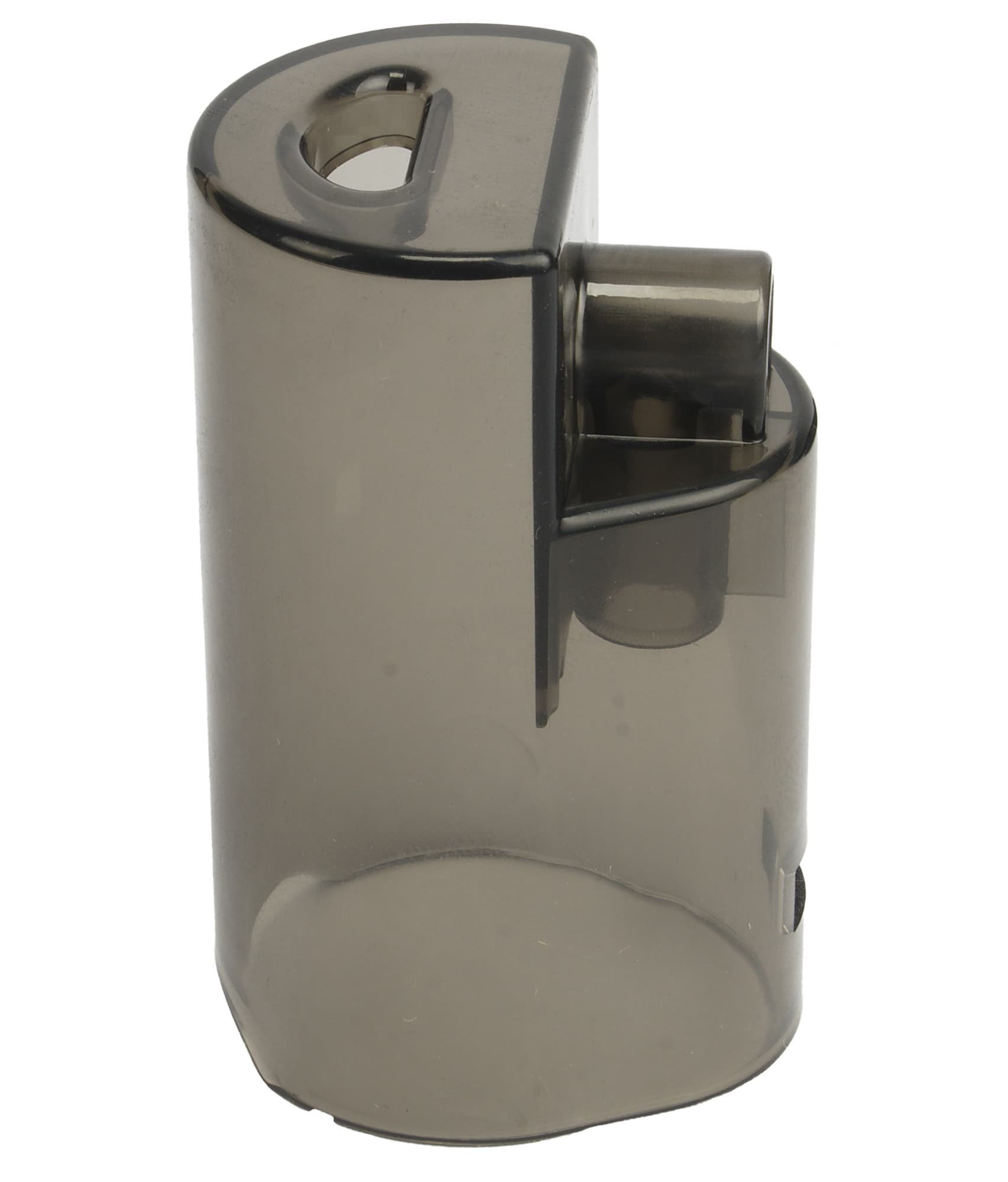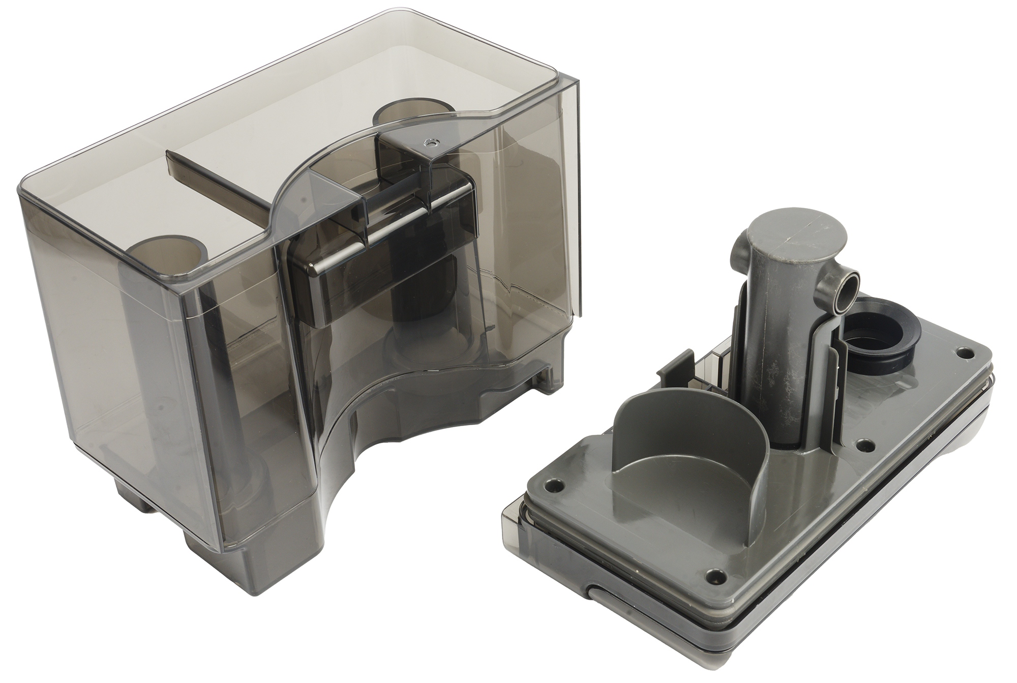 На дне емкости для грязной воды расположены два отверстия, через которые отработанная жидкость засасывается в контейнер. Отверстия имеют углубление внутрь корпуса и выглядят как две полые трубки. Такая конструкция позволяет грязной воде попадать в контейнер не проливаться при его съеме с базы.