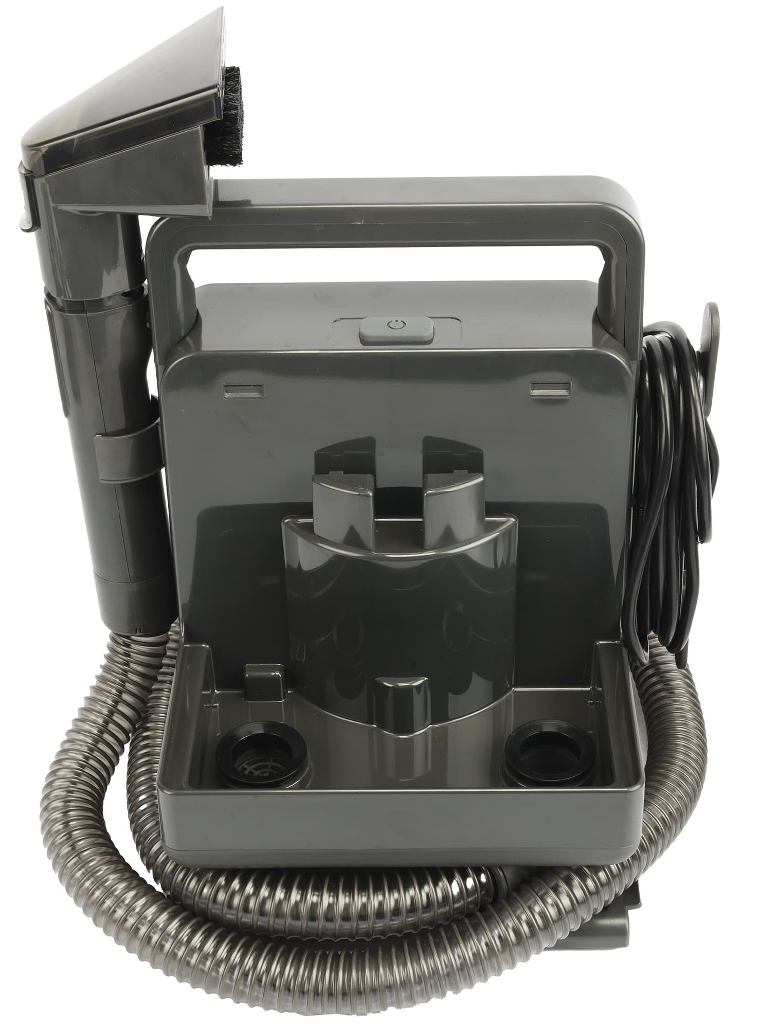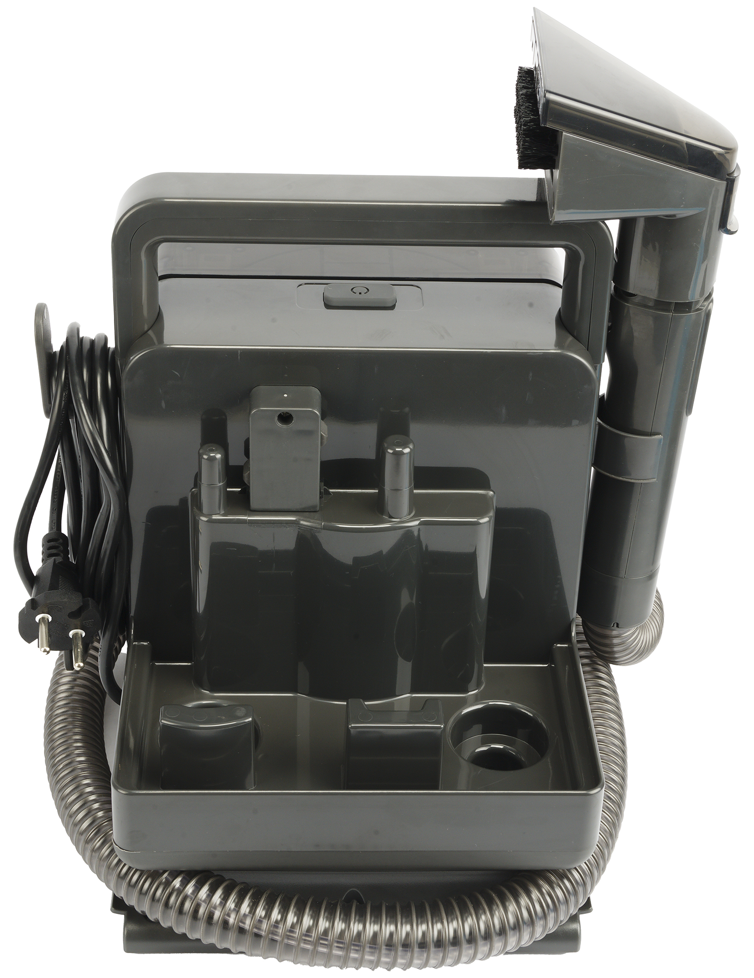 На одной из сторон корпуса размещен держатель для шланга, а на другой — два пластиковых крючка для намотки шнура электропитания. Конструкция аккуратная и в собранном виде размещается довольно компактно.