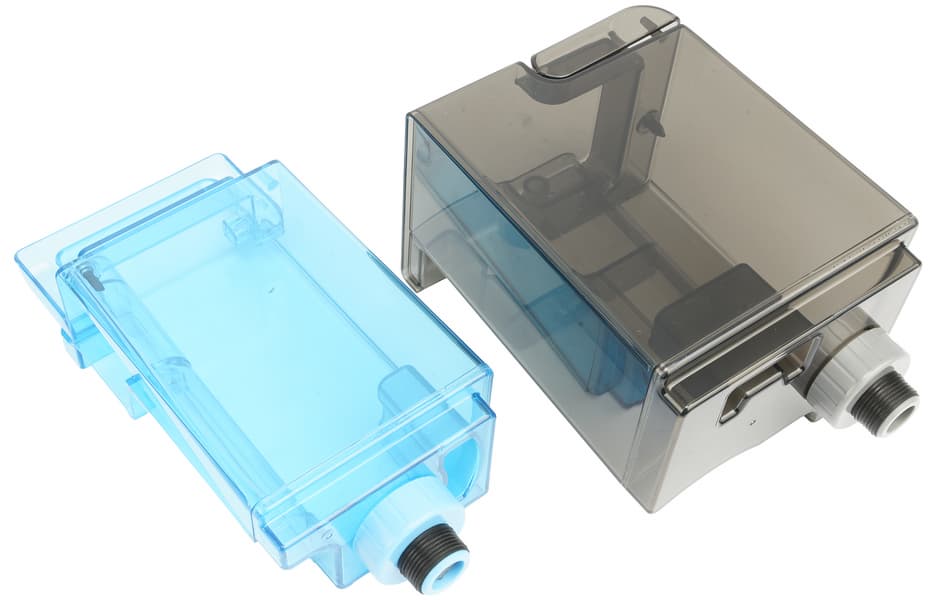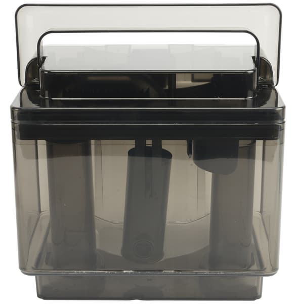 Контейнеры имеют сходную форму и конструкцию, но разный объем. Пластиковая емкость для чистящего средства голубого цвета имеет заявленный объем 600 мл, а серая полупрозрачная емкость для чистой воды — 1200 мл. У каждого бака сверху имеется удобная складная ручка для снятия с корпуса прибора и переноски.