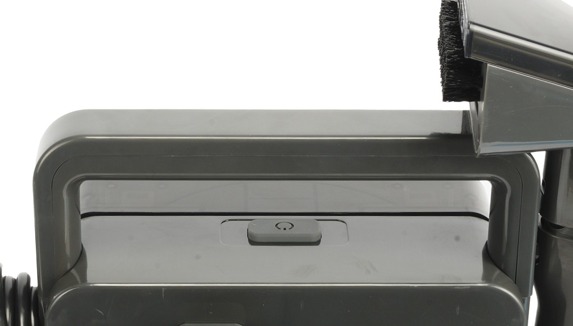 На основании устройства мы видим отсеки трех резервуаров — для чистой воды и моющего средства с одной стороны, для грязной воды — с противоположной стороны. Между ними располагается пластиковая перегородка, сверху на которой находится кнопка включения и широкая нескладная ручка, за которую удобно переносить всю конструкцию.