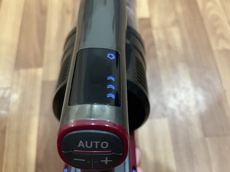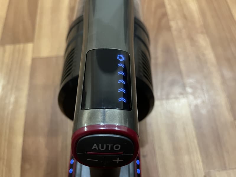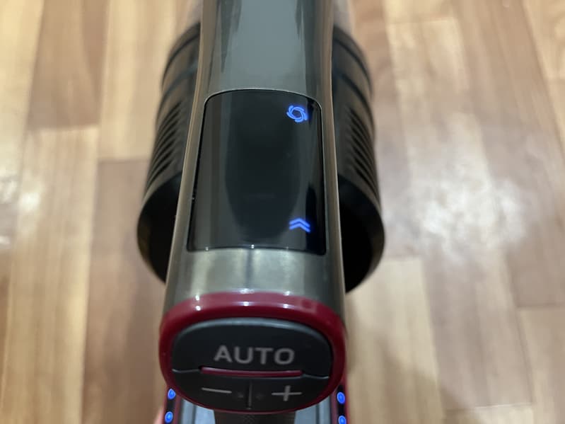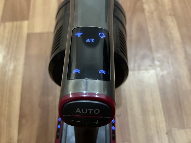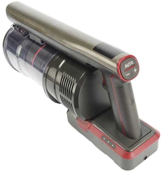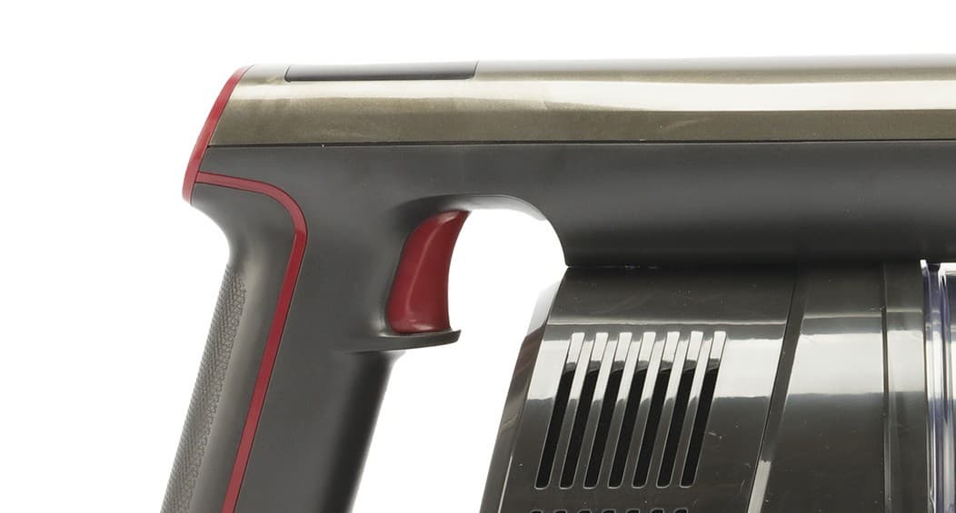 Моторный блок пылесоса оснащен ручкой пистолетного типа. При держании ручки указательный палец ложится на курок, которым запускается пылесос, остальные пальцы располагаются ниже специального выступа и удерживают саму ручку пылесоса. На вершине ручки находятся три черные кнопки управления режимами работы, а сверху над ними расположен небольшой светодиодный дисплей.