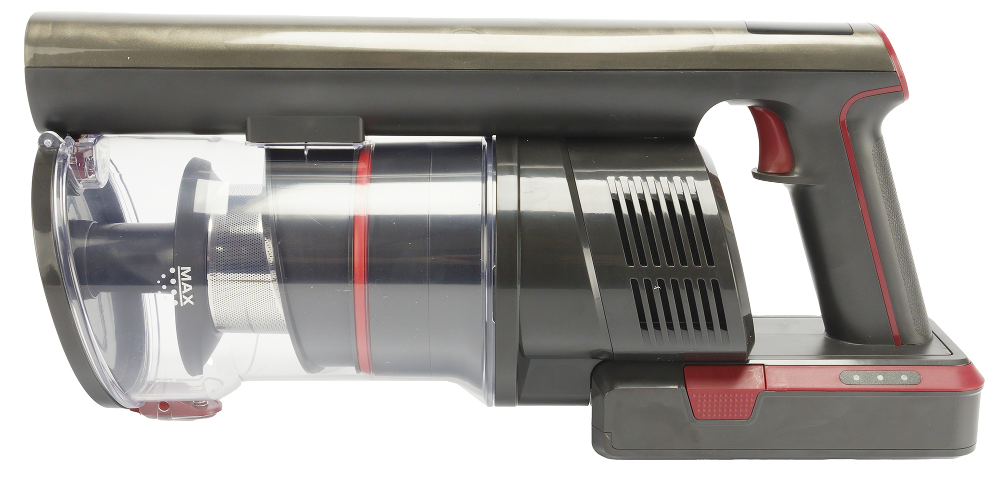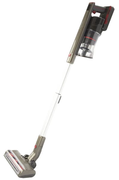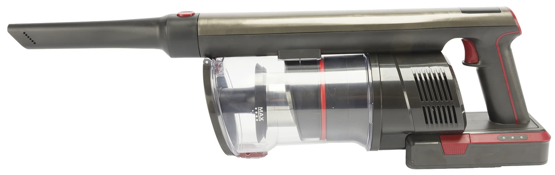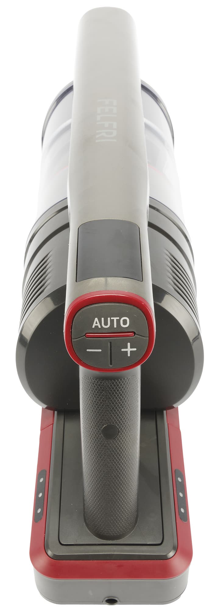 Моторный блок пылесоса оснащен ручкой пистолетного типа. При держании ручки указательный палец ложится на курок, которым запускается пылесос, остальные пальцы располагаются ниже специального выступа и удерживают саму ручку пылесоса. На вершине ручки находятся три черные кнопки управления режимами работы, а сверху над ними расположен небольшой светодиодный дисплей.