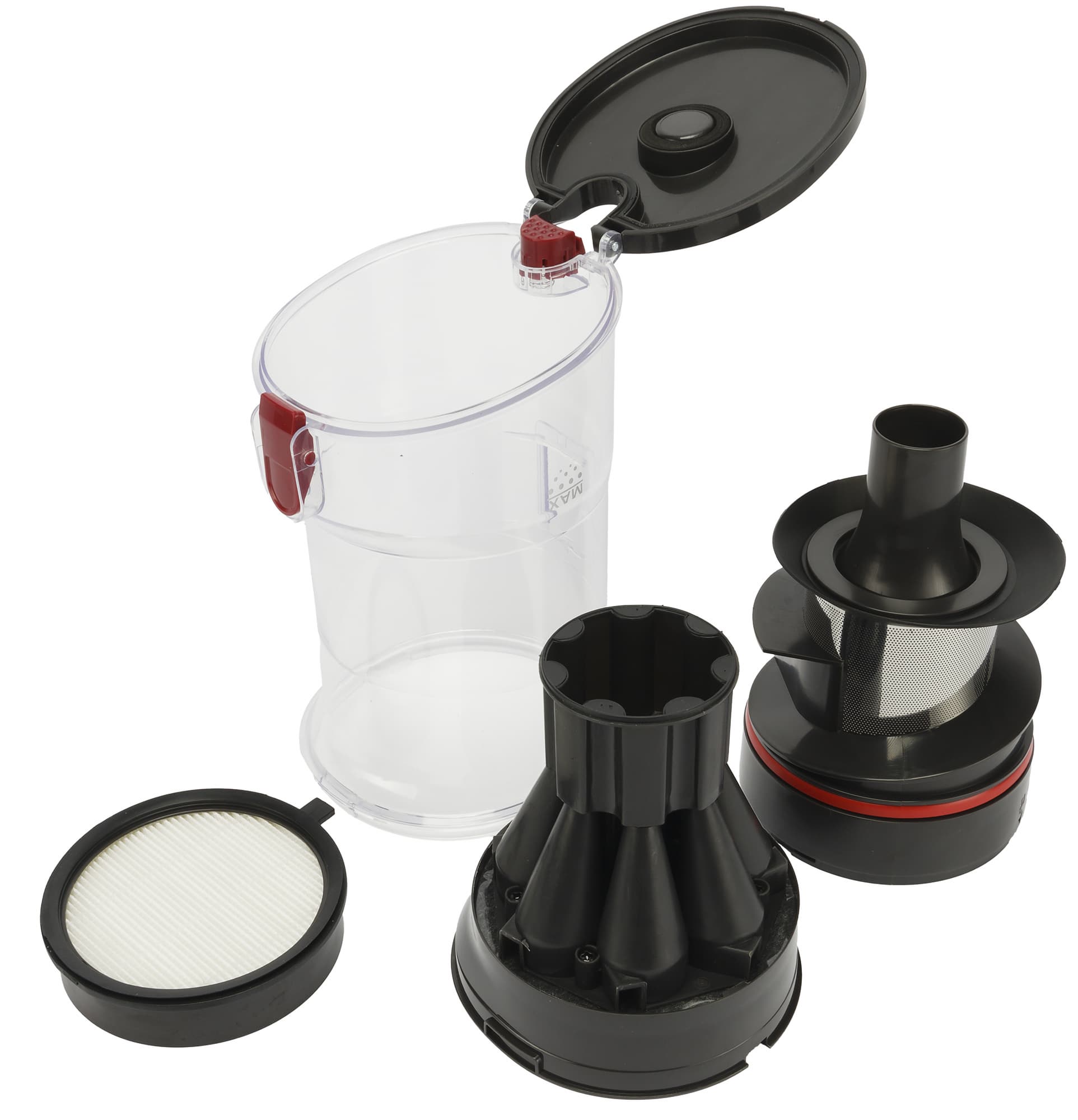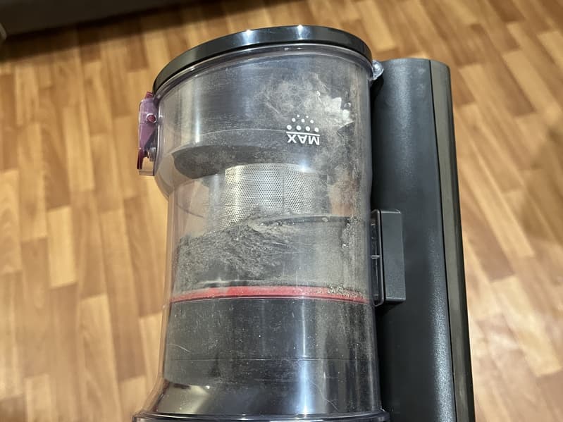 Внутри пылесборника установлена достаточно качественная система фильтрации. Сначала идет сетчатый металлический фильтр, на котором установлена резиновая «юбочка», останавливающая весь крупный мусор, затем циклонный фильтр, расположенный по центру пылесборника, а следом поролоновый и HEPA фильтры, которые устанавливаются в месте крепления пылесборника к мотору. Все они легко вынимаются для очистки и также просто устанавливаются обратно.