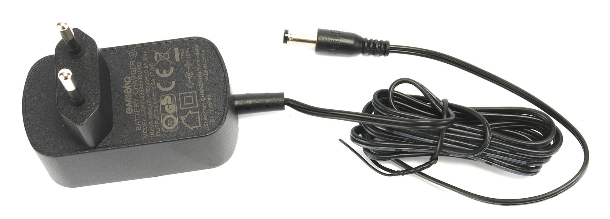 Для зарядки аккумулятора в комплекте идет адаптер питания. Согласно информации на зарядном устройстве, ток заряда составляет 0,5 А при напряжении 35 В. Адаптер можно вставлять как в снятый с корпуса аккумулятор, так и в зафиксированный непосредственно на моторном блоке — процедура одинаково простая и безопасная.