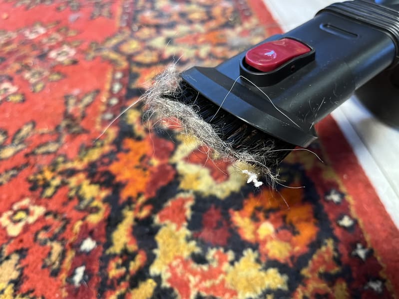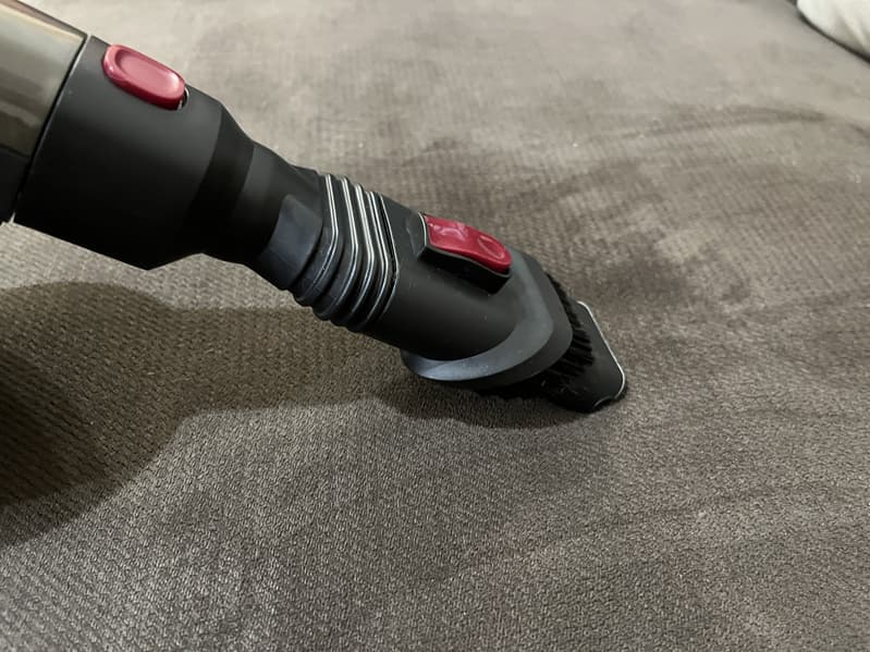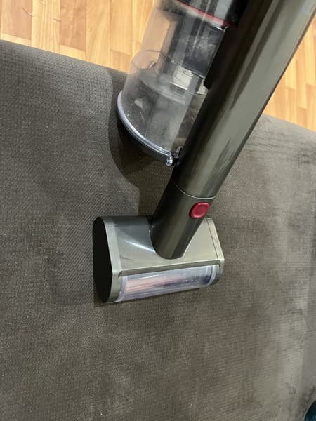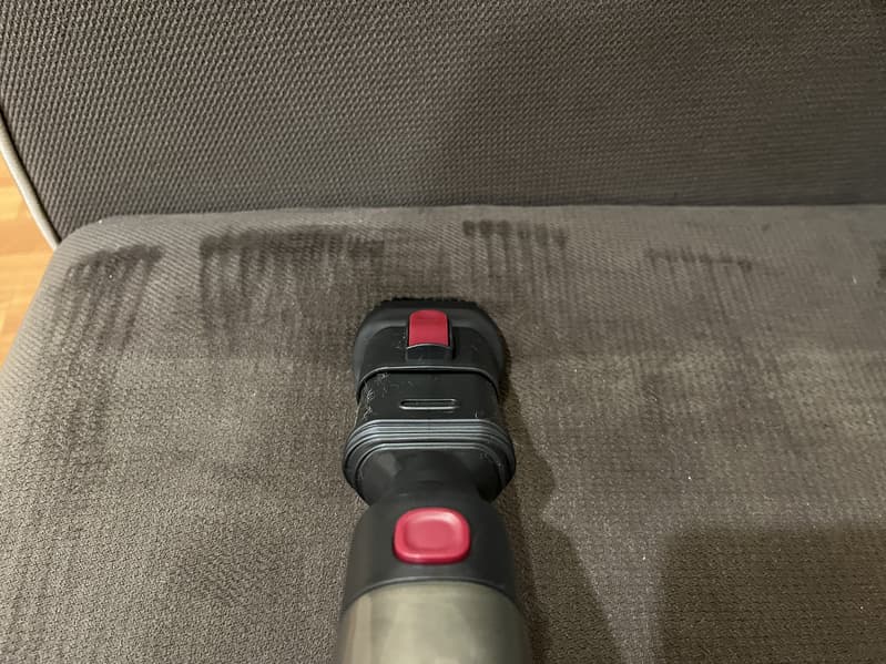Следом мы проверили насадку «2 в 1» для деликатной уборки мебели и ковров. При использовании насадки на матрасе и диване нам удалось собрать достаточно много мелкой пыли, шерсти домашних животных и крошек. Насадка очень хорошо «присасывается» к поверхности, особенно при убранной вверх щетине и направлении вперед-назад.