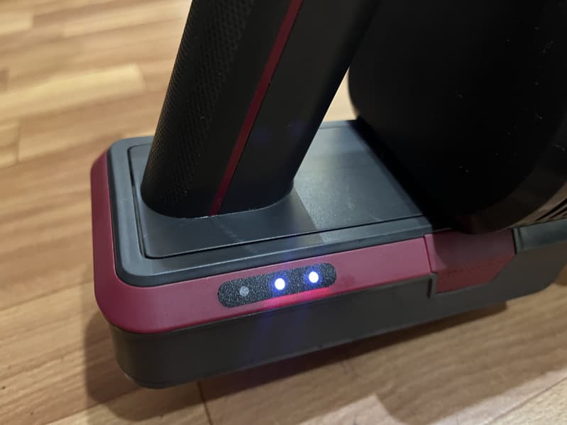 Съемный аккумулятор подключается к пылесосу 10-контактным разъемом, фиксируется одним простым движением, отстегивается при одновременном нажатии на две красные кнопки по бокам. Также по бокам аккумулятора расположены индикаторы заряда батареи, который горят белым светом и мигают во время зарядки, а по достижении полного заряда батареи — отключаются.