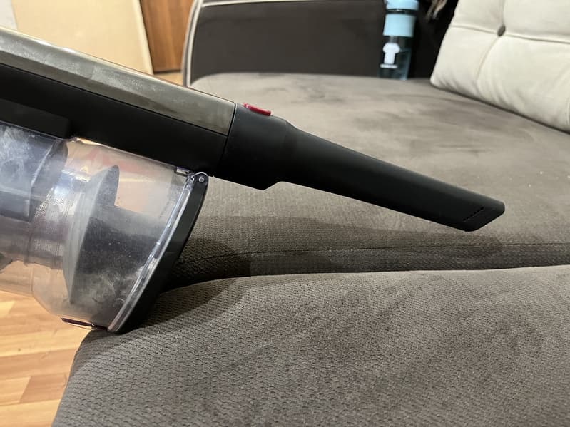 Прочный носик насадки без труда проникал в труднодоступные места благодаря своей узкой конструкции. Но нас огорчила его длина — не везде он смог дотянуться до дна, так как пылесборник начинал упираться в поверхность дивана. Была бы эта насадка длиннее в два раза — цены бы ей не было. А с такой длиной она мало чем поможет при уборке за батареей, под сидениями автомобиля или вот — в складках дивана.