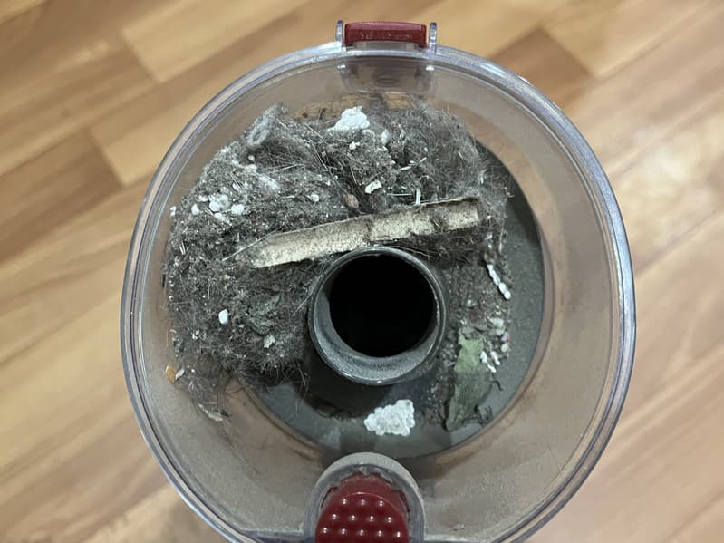Как можно видеть на фотографии, пылесос прекрасно засасывает как мелкие песчинки, шерсть, так и невесомые крупные гранулы и даже легкие кусочки пенопласта:
