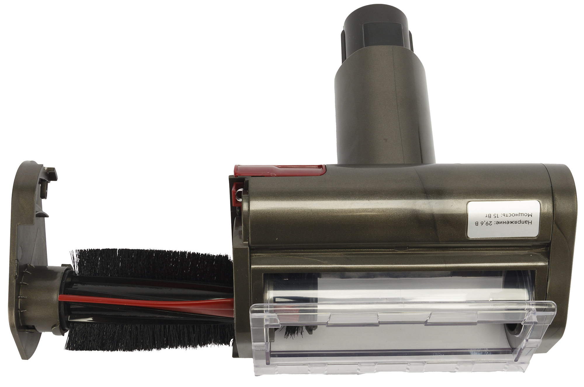 Крупный подвижный ротор внутри насадки снабжен двумя рядами жестких закрученных по полуспирали щетинок красного и черного цветов. Извлекается для очистки он достаточно просто: следует надавить на красный фиксатор, который можно увидеть снизу с левой стороны насадки, потянуть пластиковую черную заглушку вверх и затем свободно вынуть ротор. С противоположной фиксатору стороны находится шильдик с краткой технической информацией.