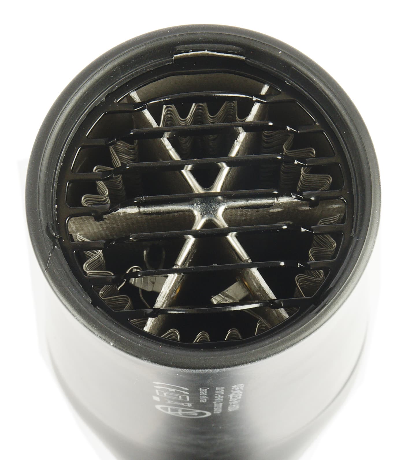 Заглянув в сопло, мы видим комбинацию из металлической проволоки и шести пластин, разделяющих поток воздуха. На выходе он дополнительно рассекается решеткой из черного металла.