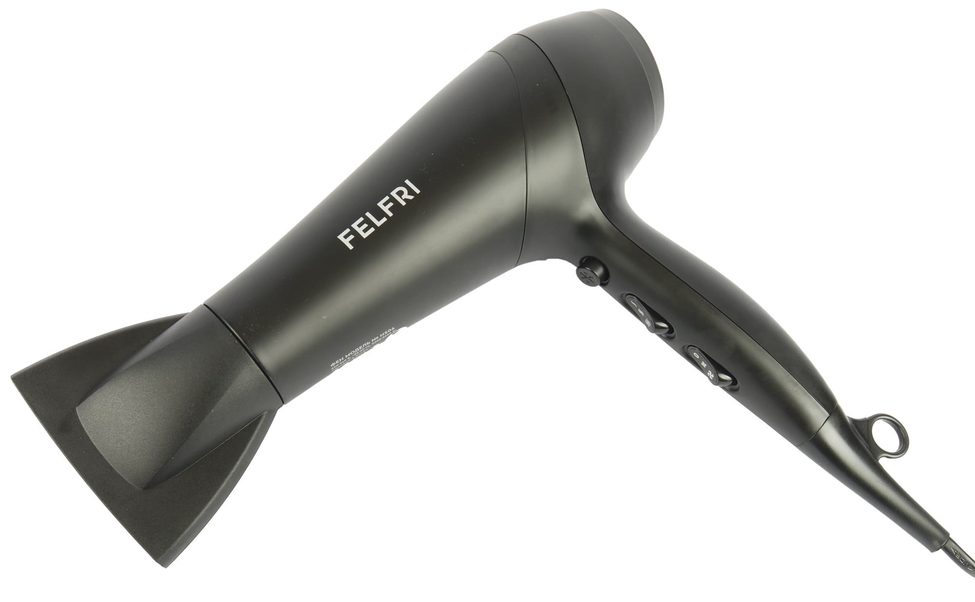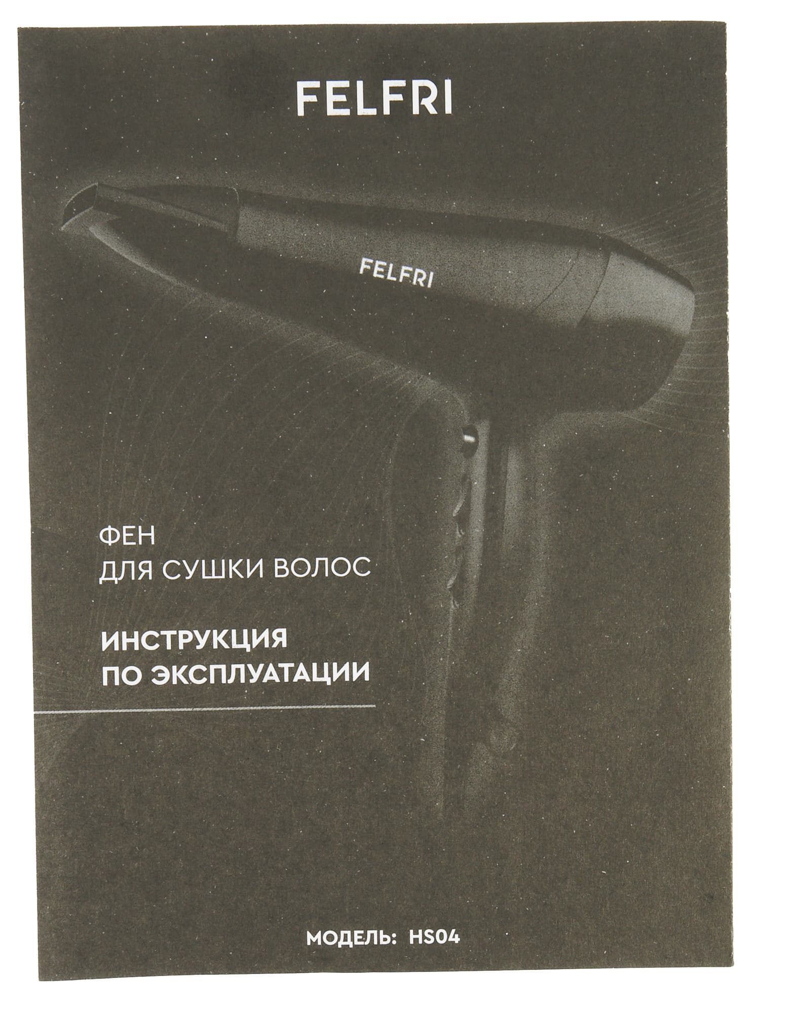 Дизайн фена Felfri HS04 подчеркнуто строгий. Корпус полностью выполнен из черного матового пластика. На лицевой стороне прибора белым цветом выделяется логотип компании.