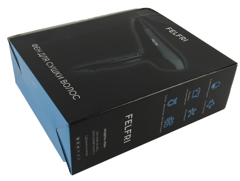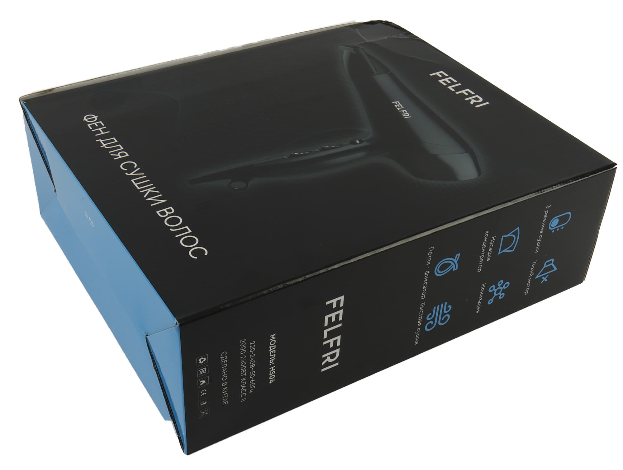 Фен Felfri HS04 поставляется в небольшой плоской коробке из прочного картона. На черном фоне глянцевой упаковки размещены фотографии устройства, логотип компании, а на одной из боковых граней — пиктограммы с обозначением ключевых особенностей прибора и транспортные значки.