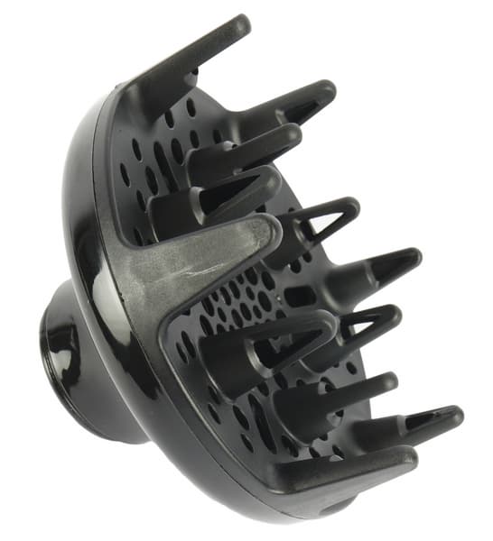 Для подчеркивания вьющихся локонов неплохо подходит диффузор. Его чаша недостаточной глубины, но, в целом, эффект от использования мы увидели. Алгоритм действий следующий: наклоняем голову, складываем мокрые пряди в чашу, подставляем фен с диффузором под прямым углом к голове и сушим. Лучше на максимальной скорости, при средней температуре, а в конце заменить ее на холодный обдув.