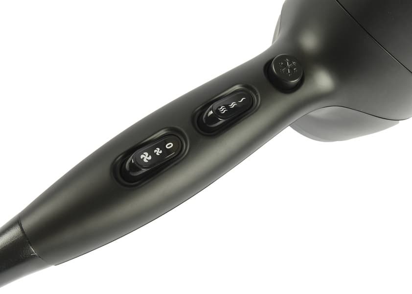 На внутренней стороне ручки размещены два переключателя (скорости и температуры) и кнопка холодного обдува. Элементы управления достаточно тугие, чтобы не нажиматься от случайного прикосновения.