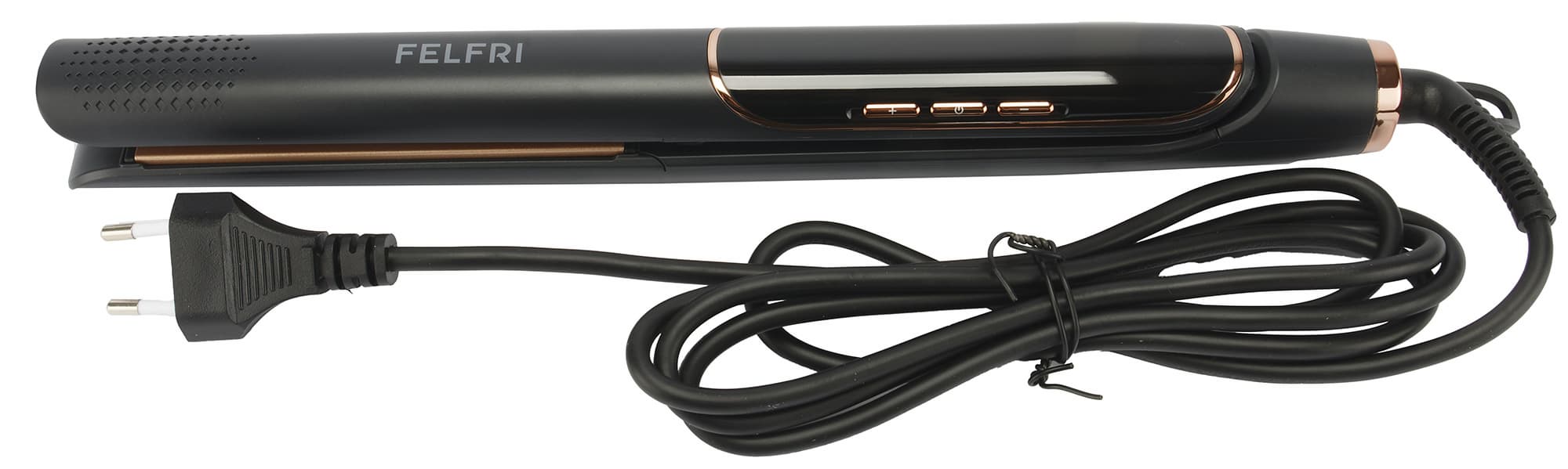 Выпрямитель Felfri HS08 упакован в небольшую картонную коробку прямоугольной формы черного цвета. На лицевой стороне размещена фотография прибора, логотип компании и наименование модели.