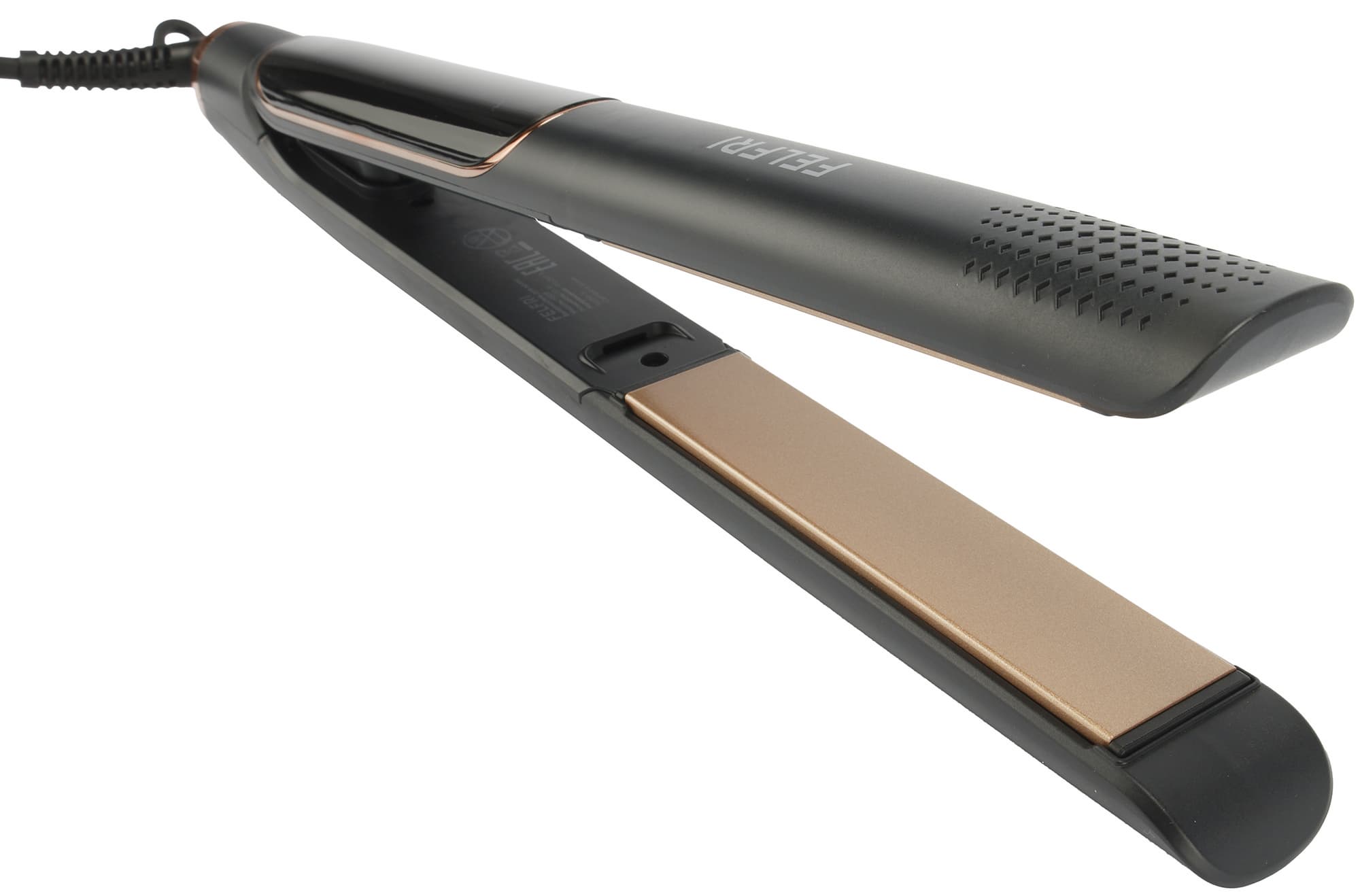 Выпрямитель классической конструкции выглядит стильно и элегантно. Корпус покрыт черным приятным на ощупь матовым пластиком и дополнен вставками медного цвета. Внутренняя поверхность и сами рабочие пластины — приглушенного бежевого цвета.