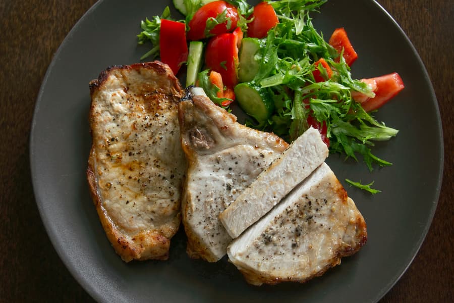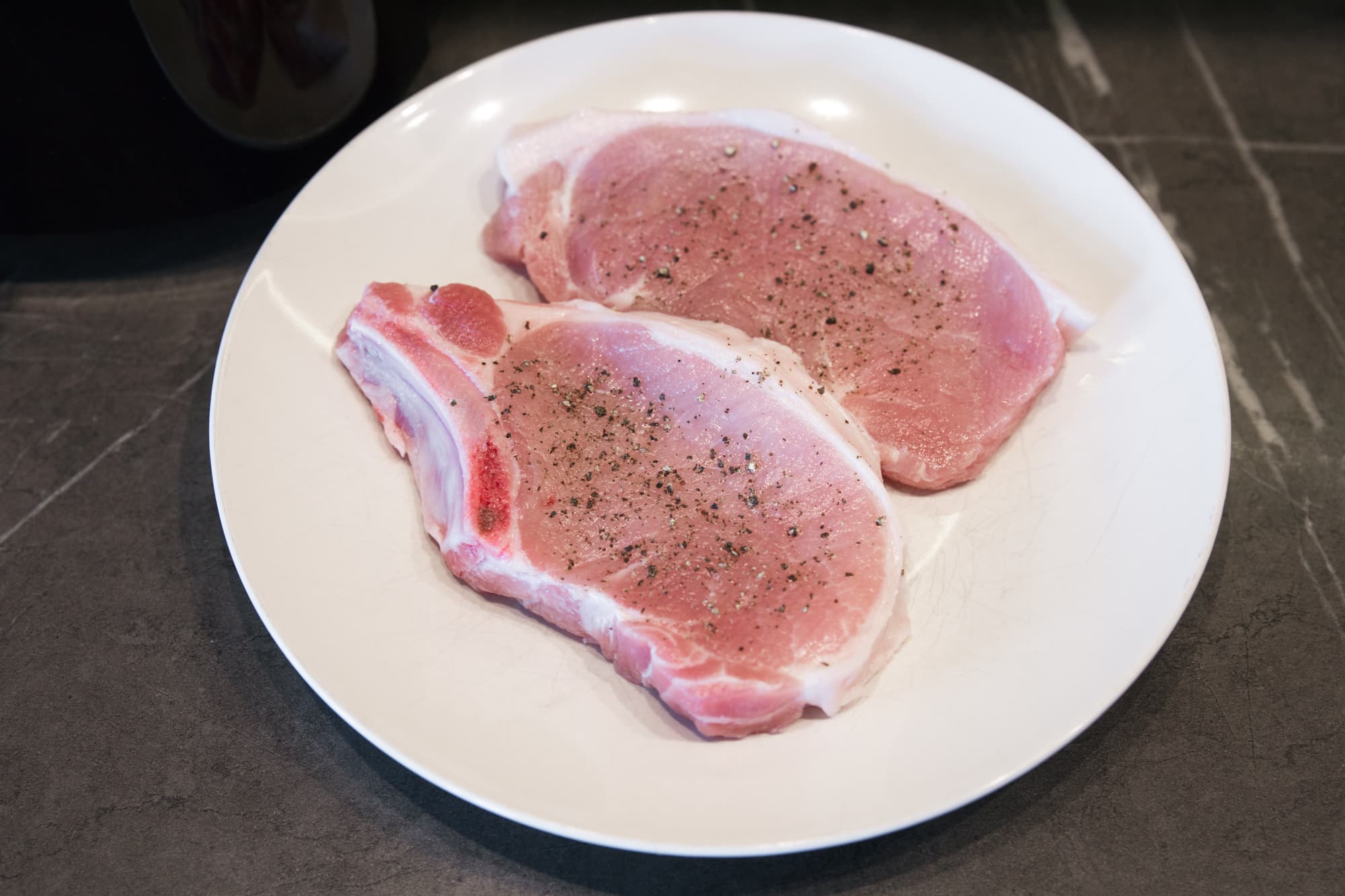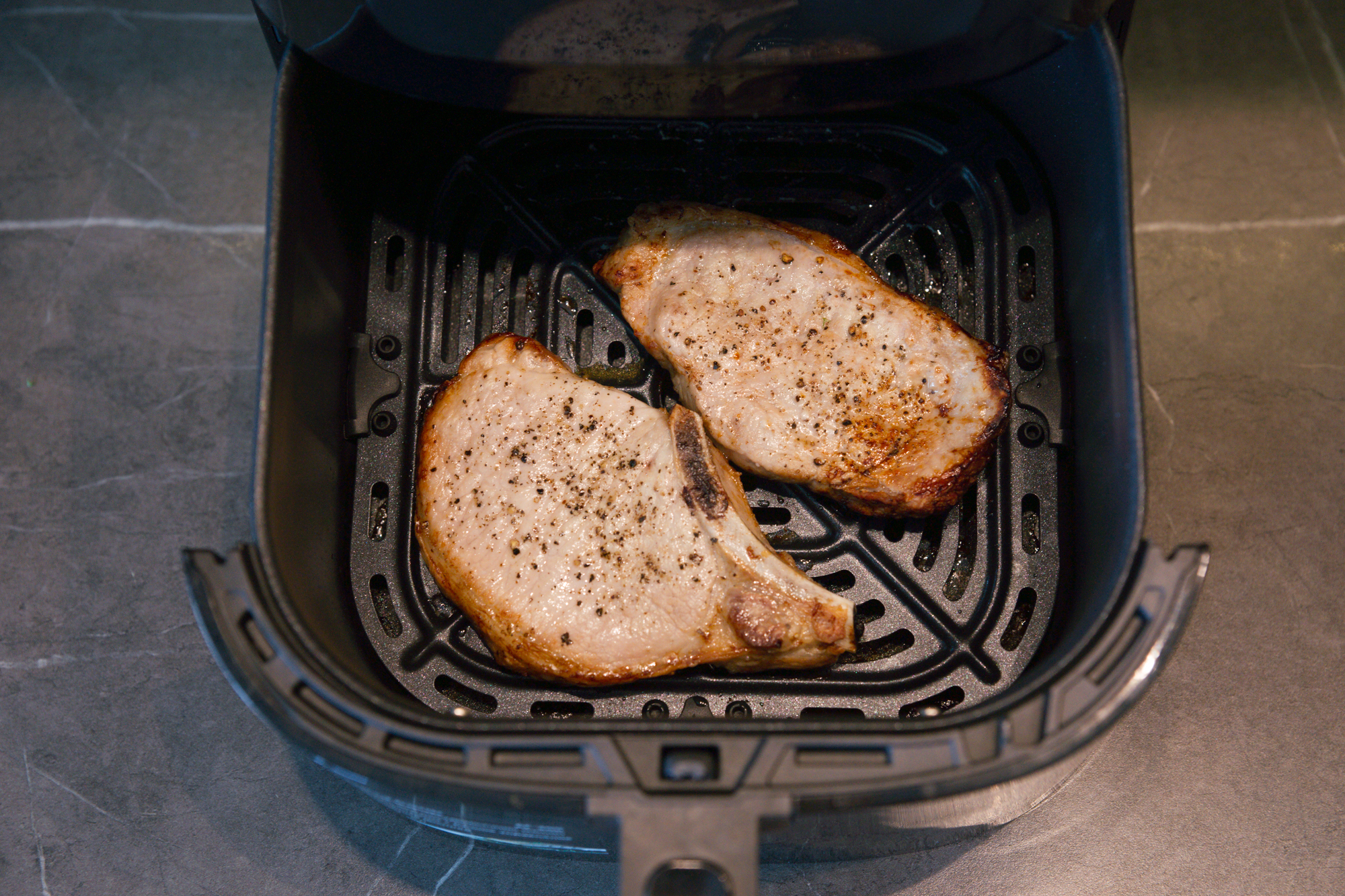 Пара кусков свинины, натертых маслом, солью и перцем, готовились 18 минут при 200 °C с одним переворачиванием.