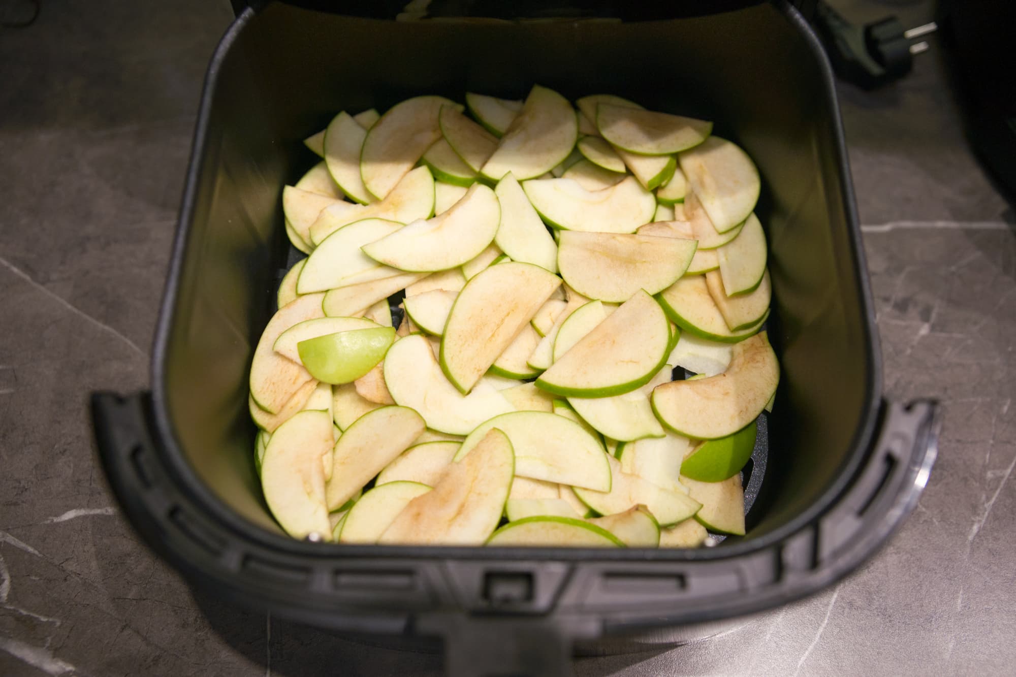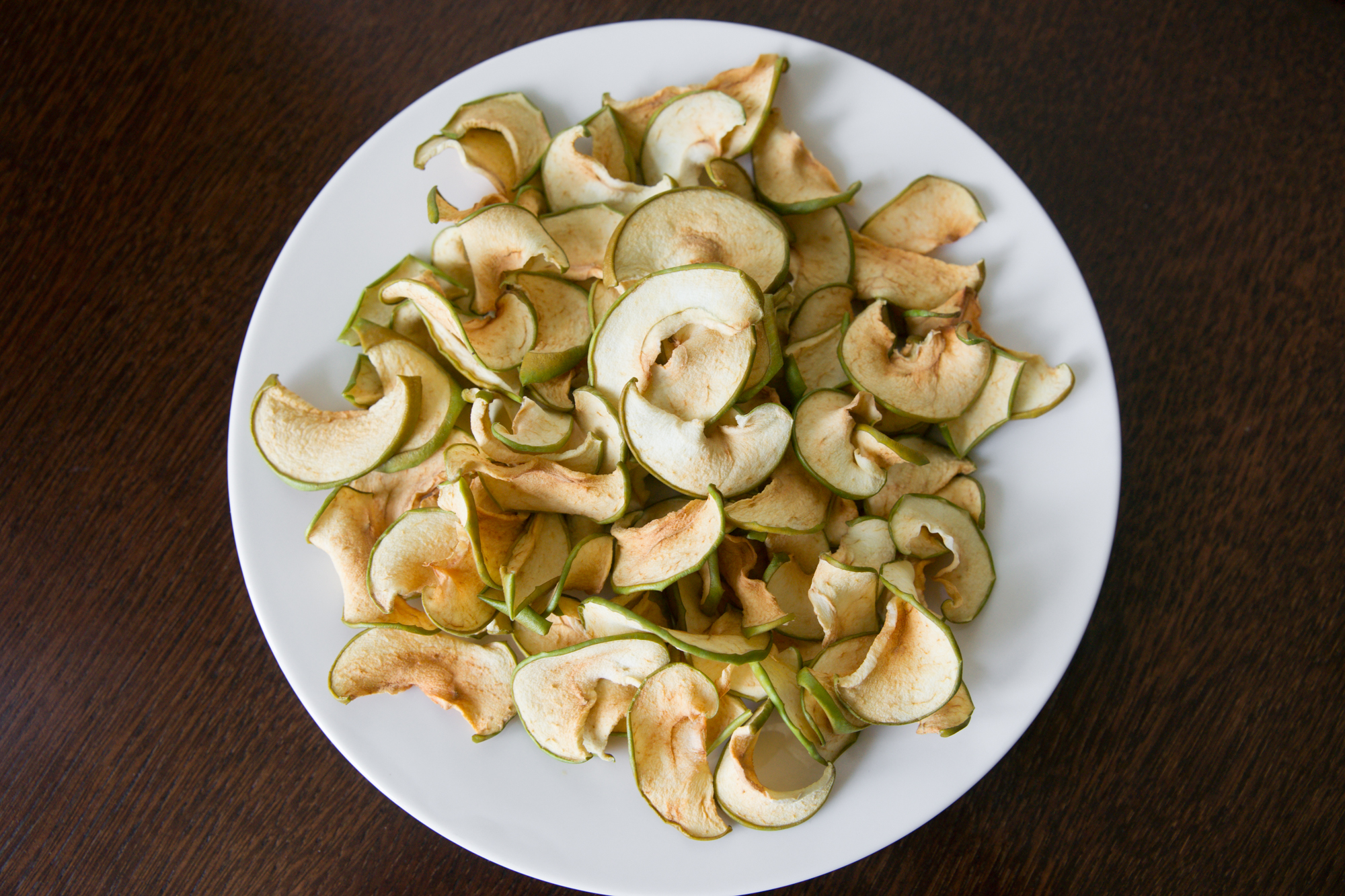 Напоследок опробовали режим для сушки фруктов и овощей. В камеру отправились яблоки, нарезанные на тонкие пластинки. По идее, нужно было раскладывать их в один слой и на решетку, но в таком случае поместилось бы максимум граммов 120. Совсем мало, подумали мы — и накидали в корзину 270 г, ровно столько получилось после нарезки трех яблок.