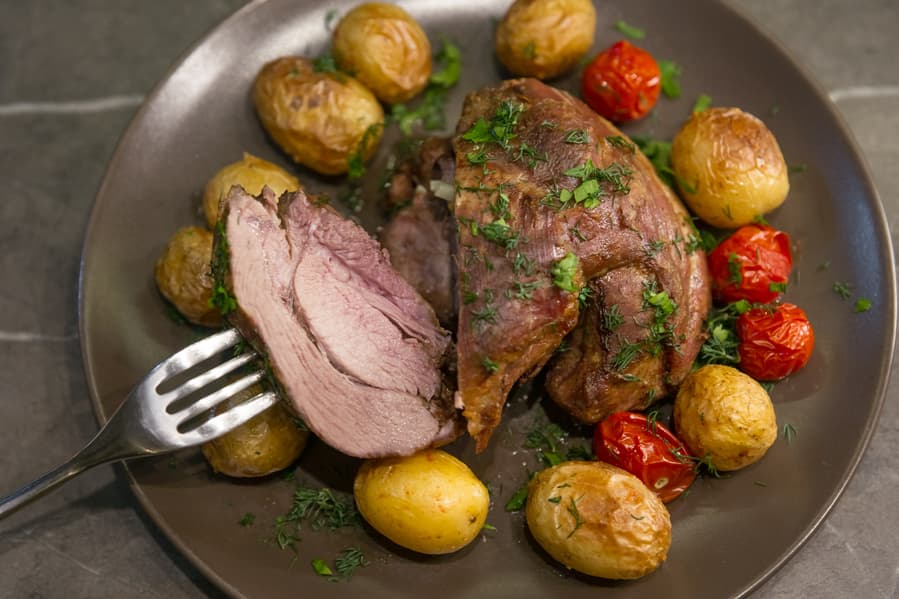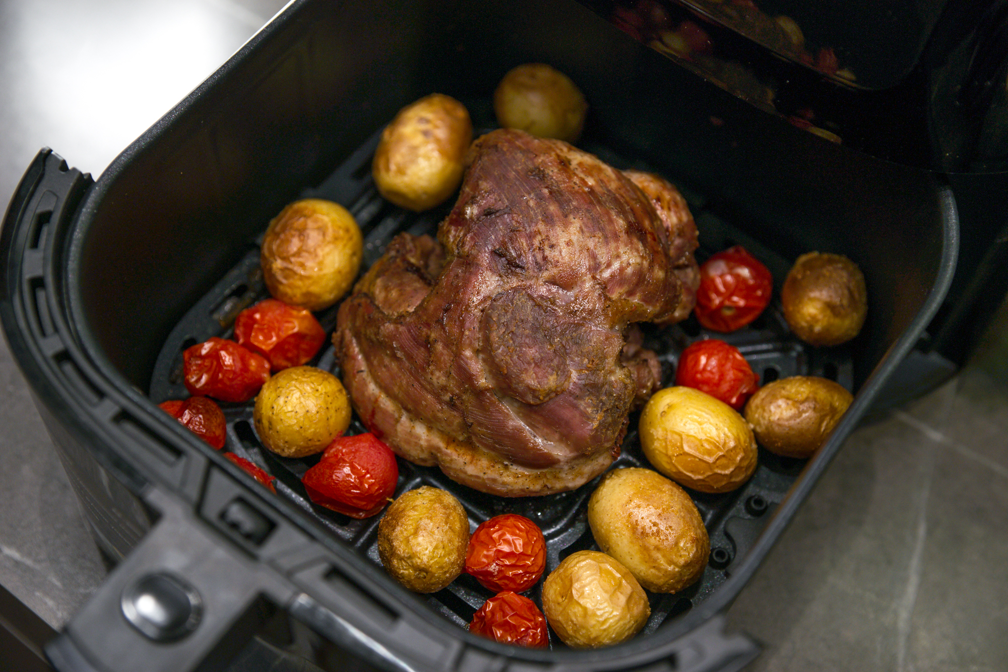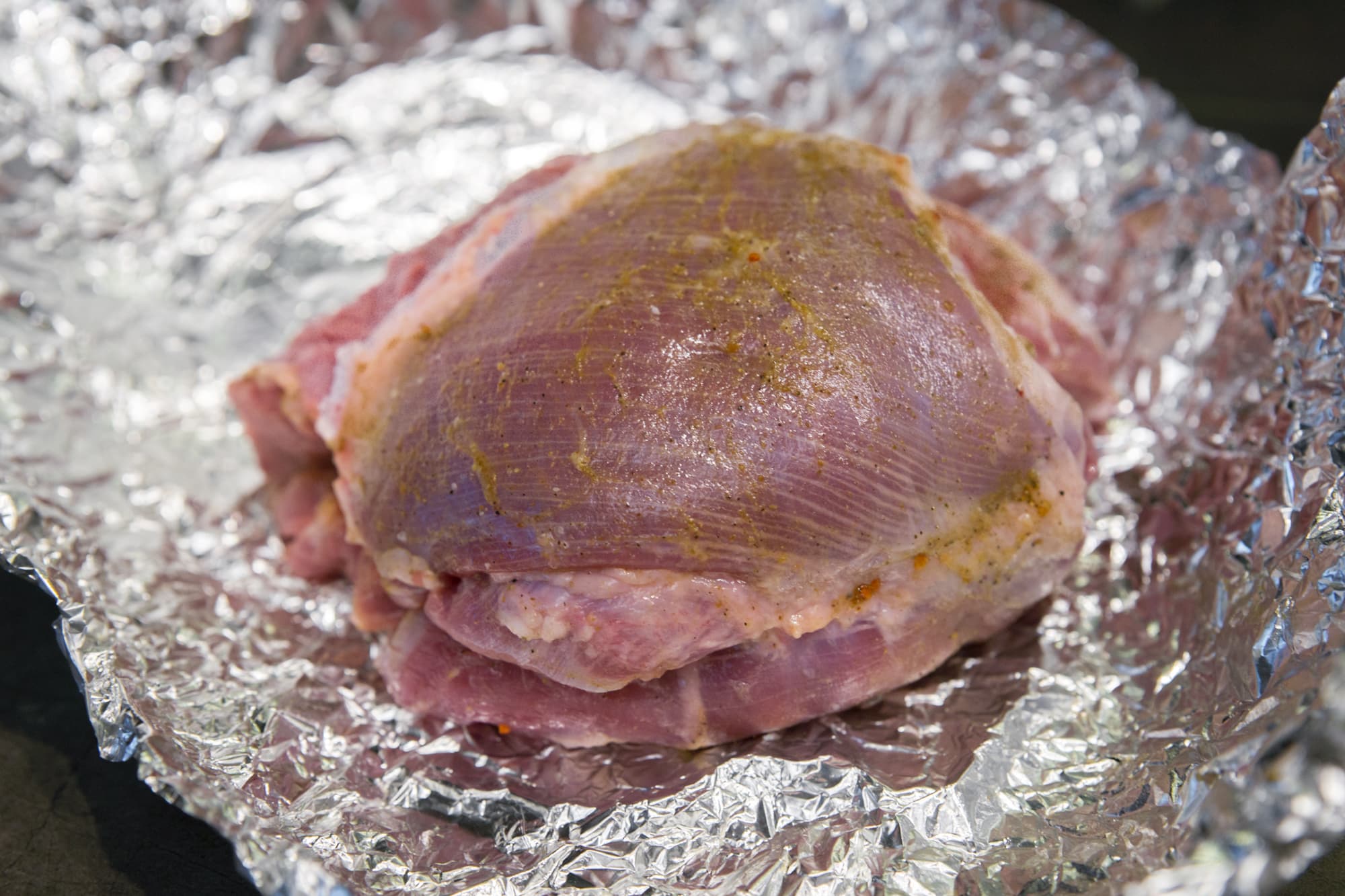 Бедро индейки весом 750 г натерли специями, посолили, внутрь уложили дольки чеснока, завернули в фольгу, завязали сверток и разместили его в корзине. Не выбирая программу, просто выставили 180 °C на 30 минут. За это время мясо почти полностью дошло до готовности.