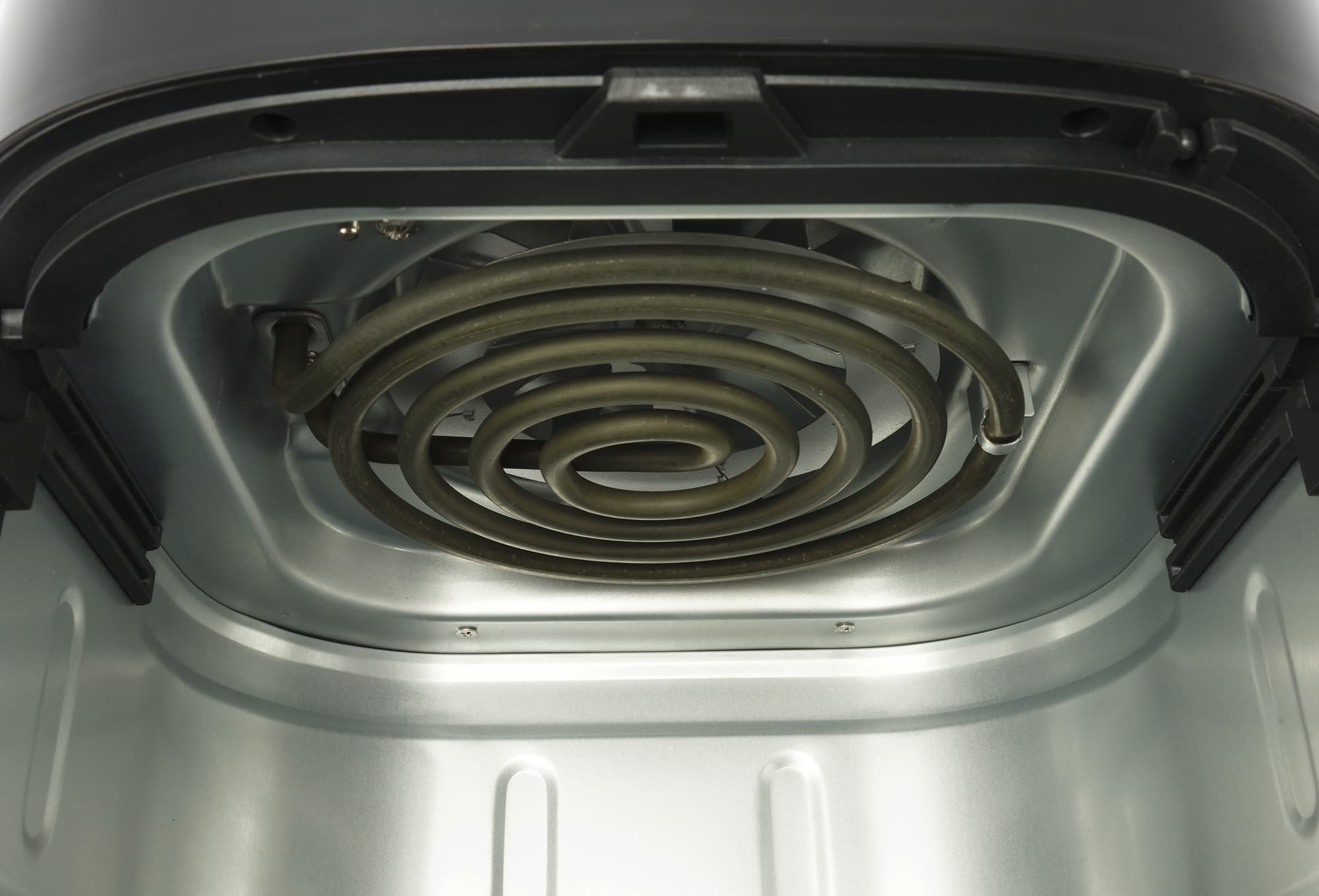 Дно и боковые стенки внутренней камеры покрыты нержавеющей сталью. В центре наверху расположен открытый спиралевидный тэн. Над ним находится вентилятор, который будет разгонять горячий воздух по камере.