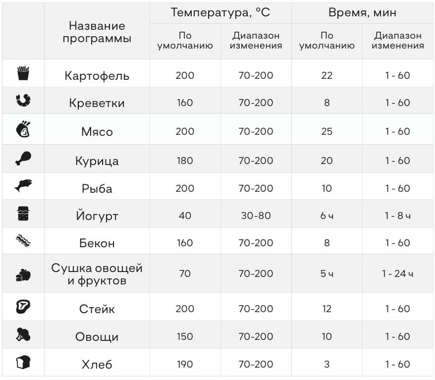 Отдельными таблицами идут описание автоматических режимов с указанием диапазонов регулировки температуры и времени, а также советы по выбору параметров при приготовлении самых популярных блюд в зависимости от объема.