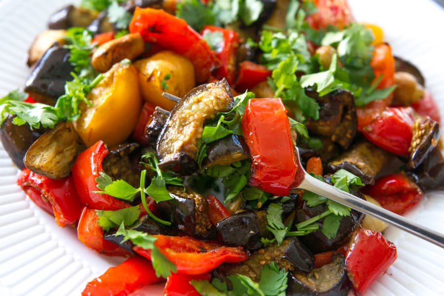 Баклажан, помидор, пару болгарских перцев крупно нарезали, добавили к ним дольки чеснока, растительного масла, хмели-сунели и соль. Перемешали и выложили в чашу.