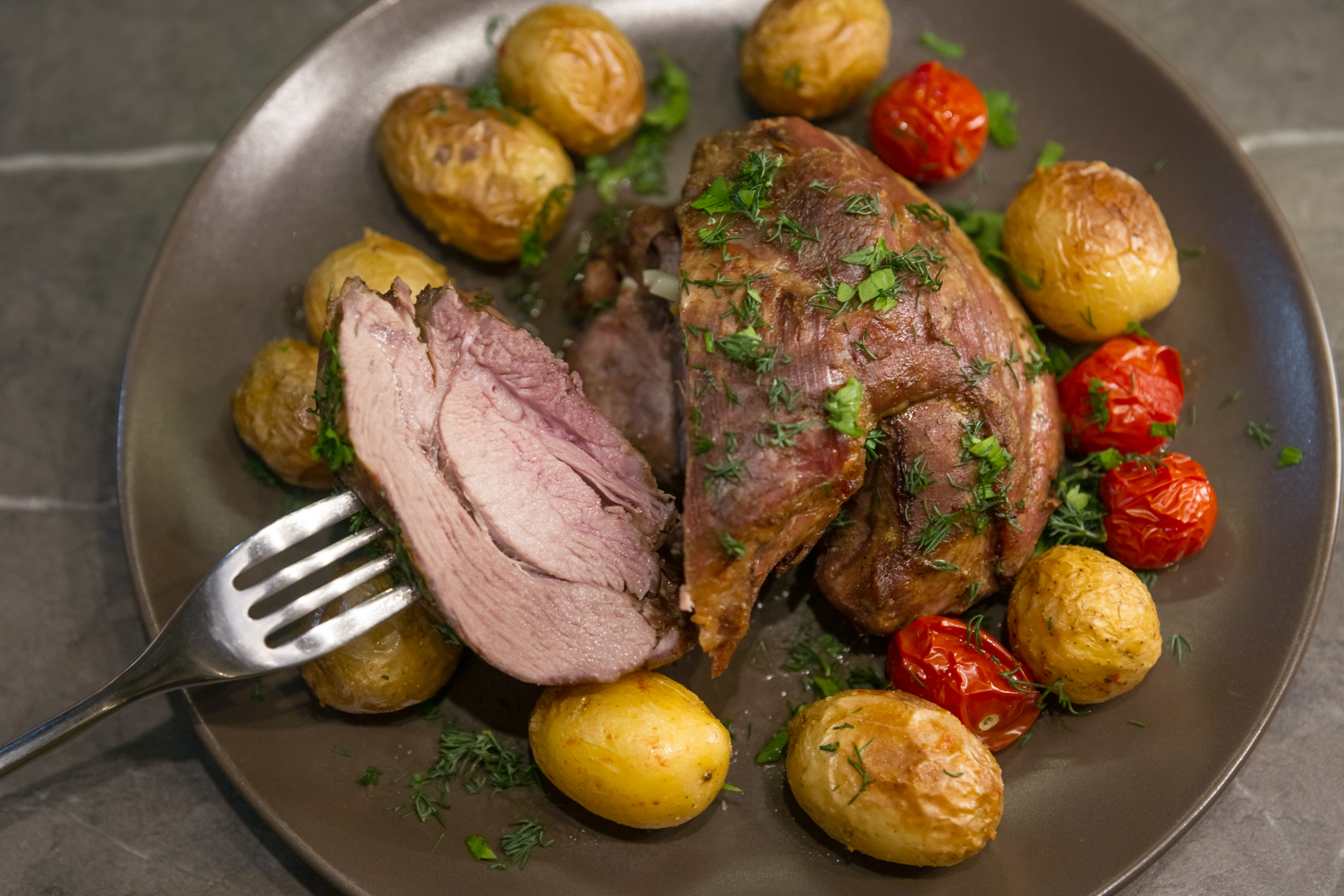 Убрали фольгу, переложили кусок на решетку, добавили помидоры-черри и предварительно отваренный картофель, поверхность индейки слегка смазали растительным маслом и установили 200 °C еще на 15 минут.