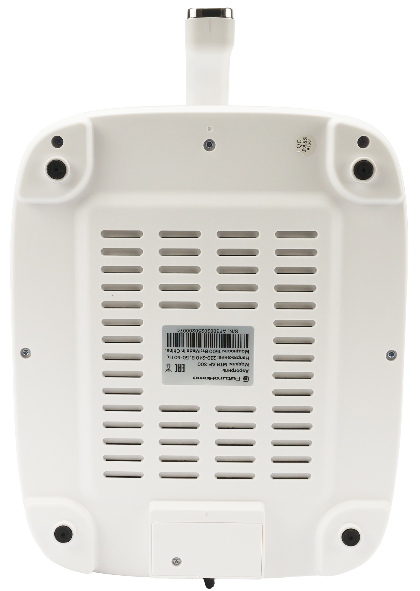 Корпус устойчиво стоит на четырех ножках с резиновыми вставками. На дне мы также видим серебристый шильдик с краткой технической информацией о приборе.
