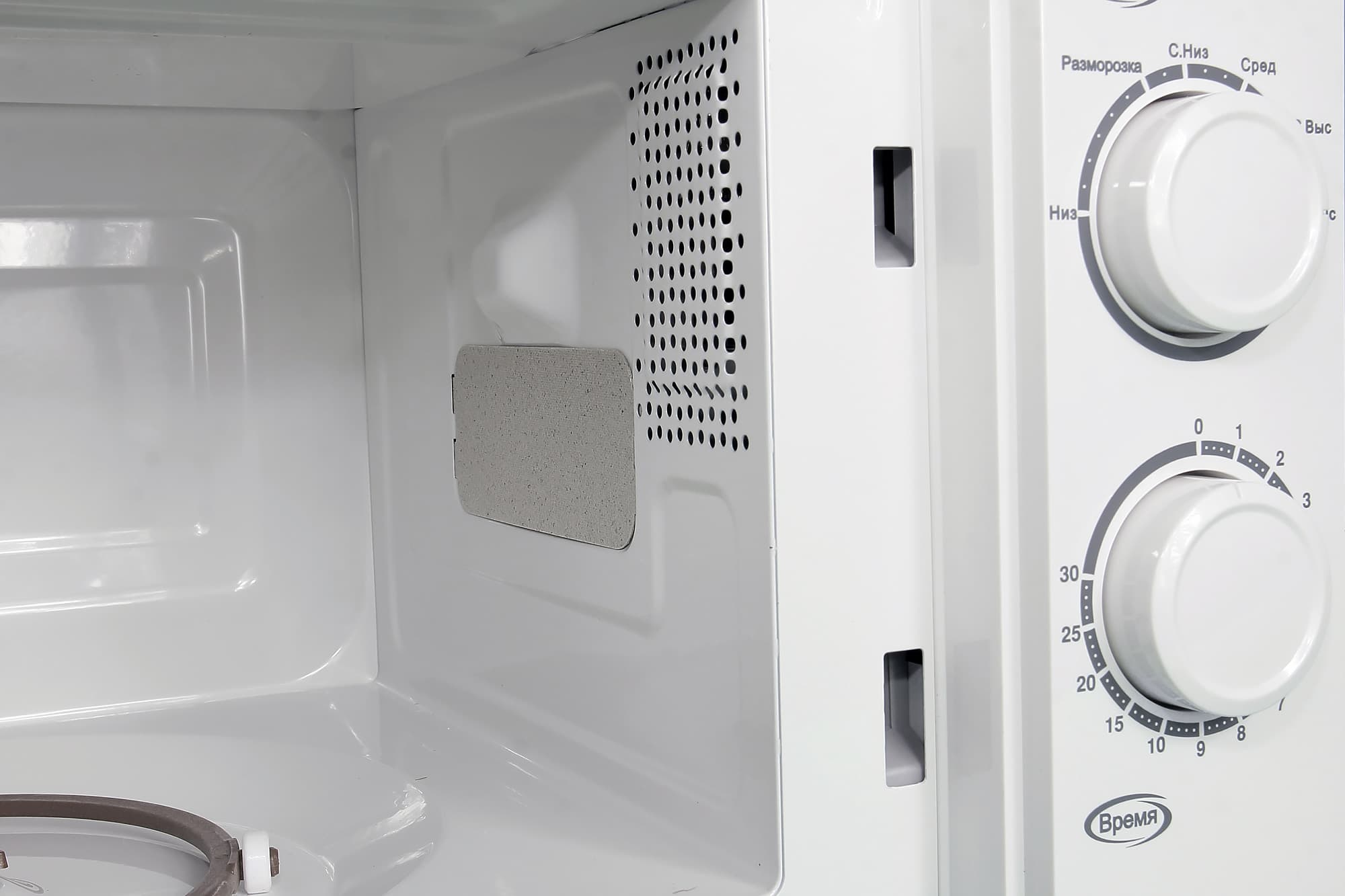 Форма внутренней части СВЧ-печи стандартна. Поверхность стенок рабочей камеры покрыта эмалью белого цвета. Волновод находится по центру правой стенки камеры. Правее и выше от него, под отверстиями расположена яркая лампа, освещающая пространство во время работы.