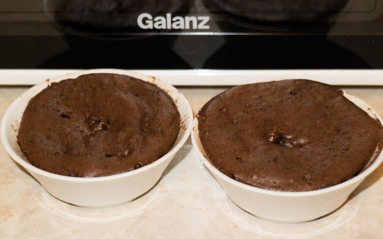 Включили микроволновую печь в режиме максимальной мощности на три с половиной минуты. Вообще указанный объем теста выпекается примерно три минуты, но учитывая не самую высокую мощность печи и две емкости с тестом, было решено увеличить продолжительность обработки на 30 секунд.