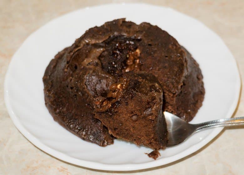 За это время кексы отлично поднялись и пропеклись внутри. Шоколад подтаял и подогрелся. Очень быстрая и неплохая на вкус выпечка-пятиминутка.