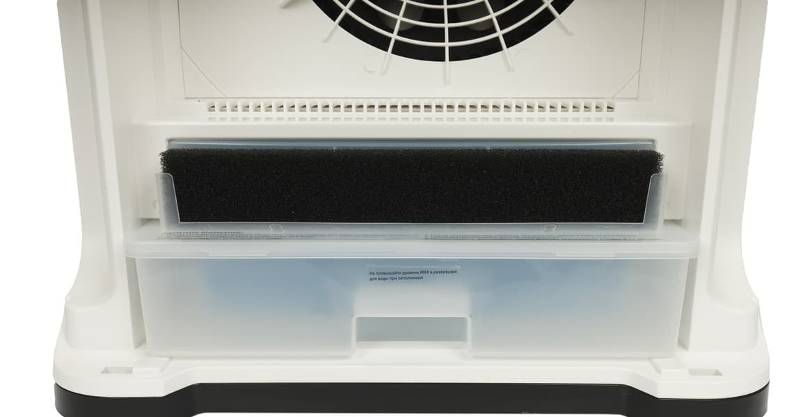 Передняя панель откидывается, предоставляя доступ к прямоугольному воздушному фильтру и увлажняющему блоку.