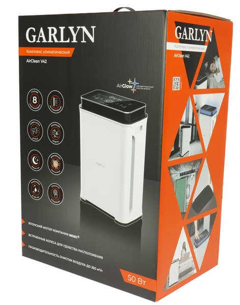 Климатический комплекс Garlyn AirClean V42 поставляется в большой картонной коробке с полноцветной печатью, оформленной в фирменном черно-оранжевом стиле.