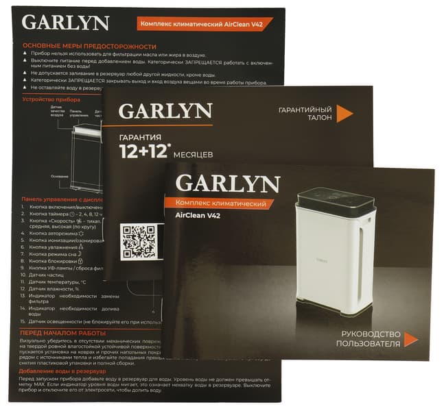 Бытовая техника Garlyn всегда отлично документирована, и AirClean V42 — не исключение: инструкция составлено подробно, аккуратно и грамотно. В брошюре подробно рассказывается об устройстве климатического комплекса, управлении прибором и уходе за ним.