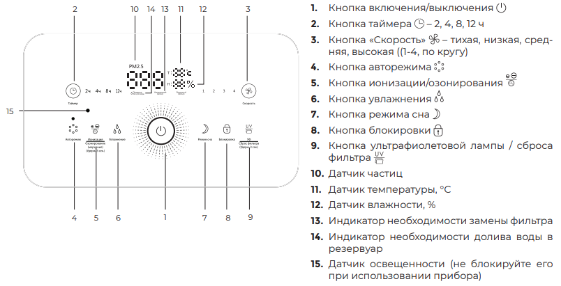 Всю верхнюю часть воздухоочистителя занимает темная панель управления с белыми пояснительными надписями. Под ее пластиковой поверхностью скрываются светодиодные индикаторы, невидимые на выключенном приборе. Чуть ниже мы рассмотрим их повнимательнее.
