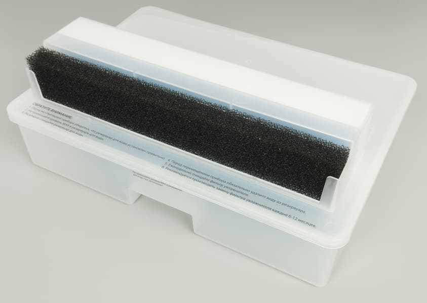 Увлажняющий фильтр при загрязнении следует положить в воду и очистить мягкой щеткой, высушив перед следующим использованием. Делать это рекомендуется раз в неделю.