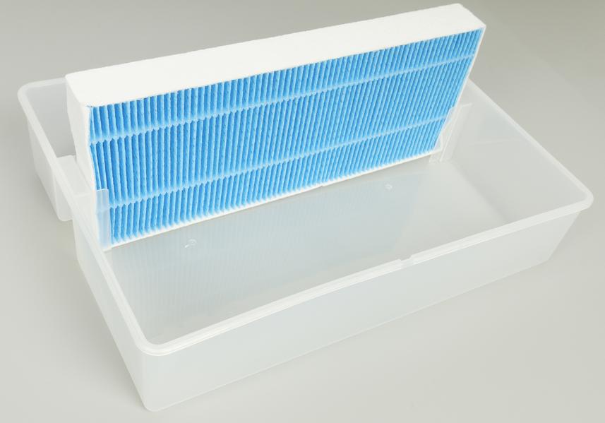 Он представляет собой прямоугольную ванночку объемом 3 литра, в которую наполовину погружены предварительный поролоновый и увлажняющий фильтры.
