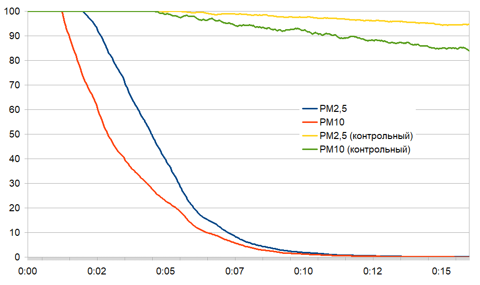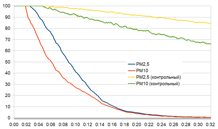 | Снижение загрязнения частицами PM2.5 на 50% от максимума, мин:сек | 4:33 |
