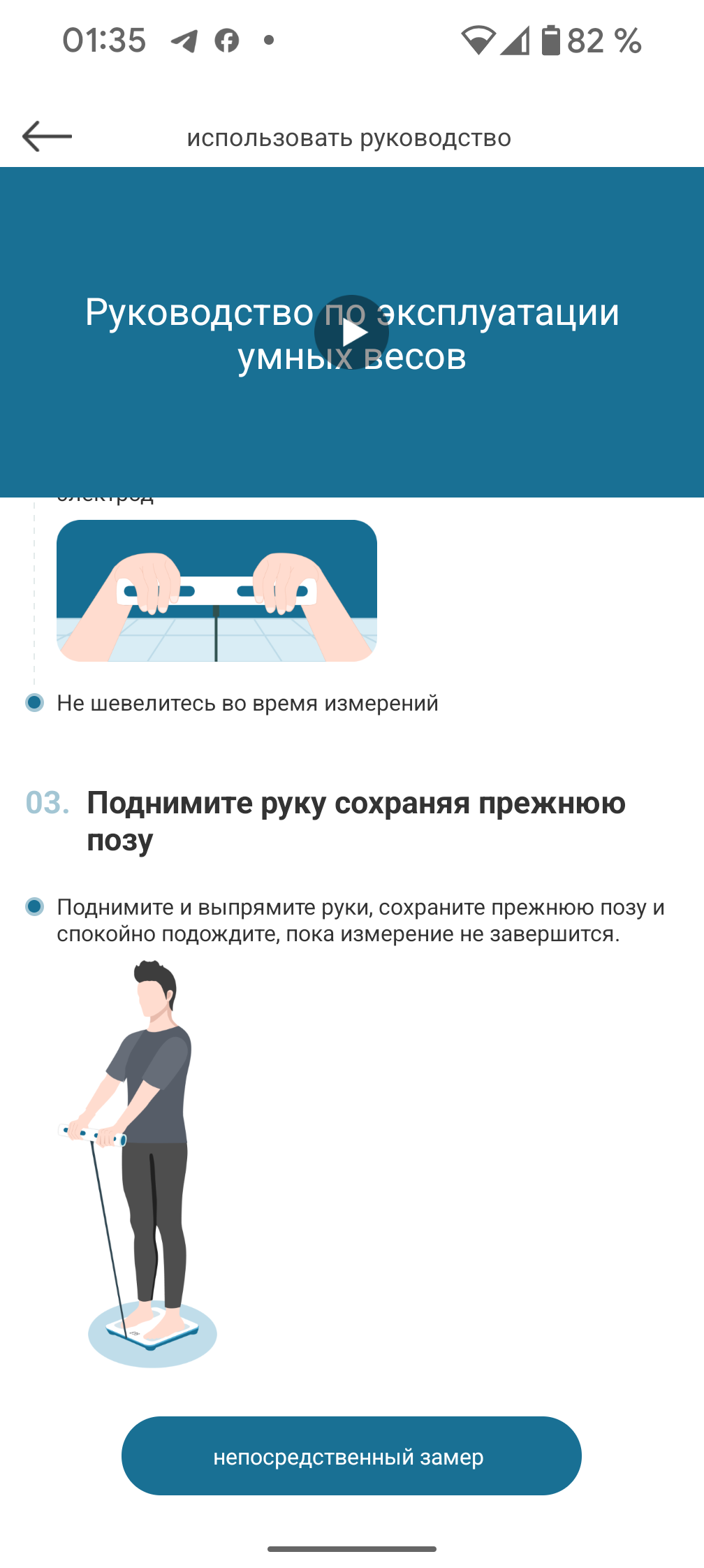 Перед первым взвешиванием приложение подробно рассказывает, как правильно провести измерения тела. Пользователю необходимо встать на платформу, равномерно наступая босыми подошвами на все четыре электрода, взяться за ручку, выдвинув шнур на соответствующее росту расстояние и, удерживая ее всеми пальцами с обеих сторон, поднять руки на угол в 45° от тела.