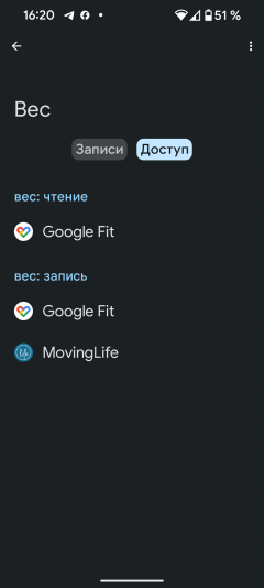 Для экспорта в сторонние приложения мы, разумеется, должны разрешить MovingLife обмениваться результатами измерений с системой. К сожалению, регулярно используемый нами Google Fit умеет принимать из других приложений только информацию о весе и проценте жира в организме — но и это весьма полезно.