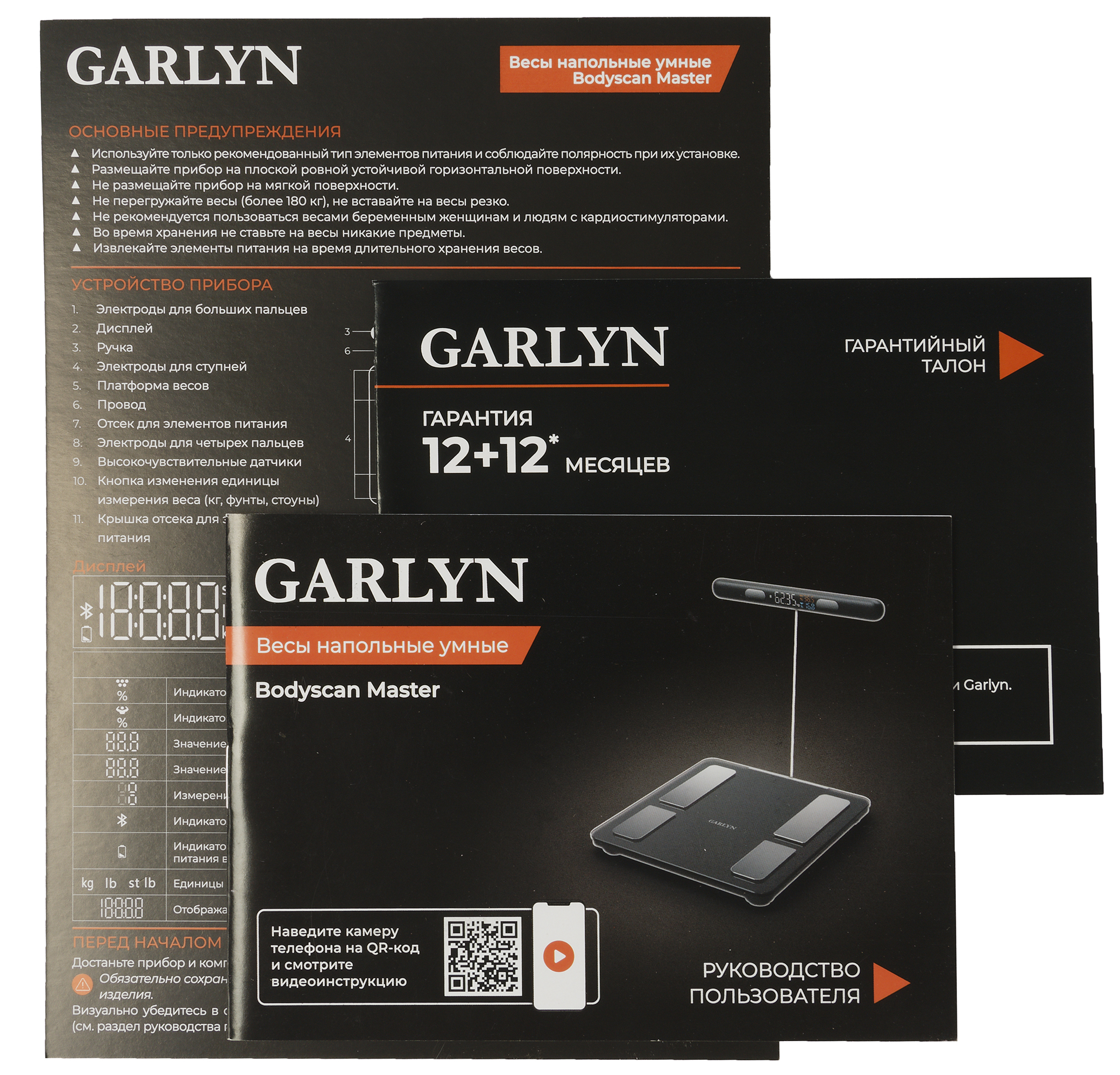 Инструкция для Garlyn BodyScan Master IMB-01 в виде небольшой книжечки формата А6, напечатанной на плотной качественной глянцевой бумаге.