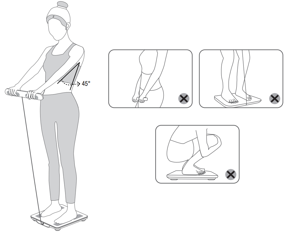 В приложении и руководстве описывается правильная поза при проведении измерений. Ручку весов следует плотно держать в обеих руках так, чтобы все четыре электрода были прижаты к пальцам: большим на одной паре контактов и остальными — на второй. Руки при этом нужно держать вытянутыми под углом приблизительно 45° к телу. Нельзя опускать руки, сгибать конечности и приседать. Во время измерений желательно сохранять полную неподвижность.