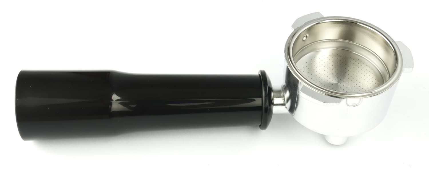 Рожок из светлого легкого металла (вероятно, силумина) — вполне традиционных для бюджетных кофеварок этого типа размеров и конструкции. На пластиковой ручке отсутствует откидной держатель фильтра, но надобности в нем нет: при ополаскивании фильтр надежно удерживается в корпусе благодаря фиксирующему выступу.