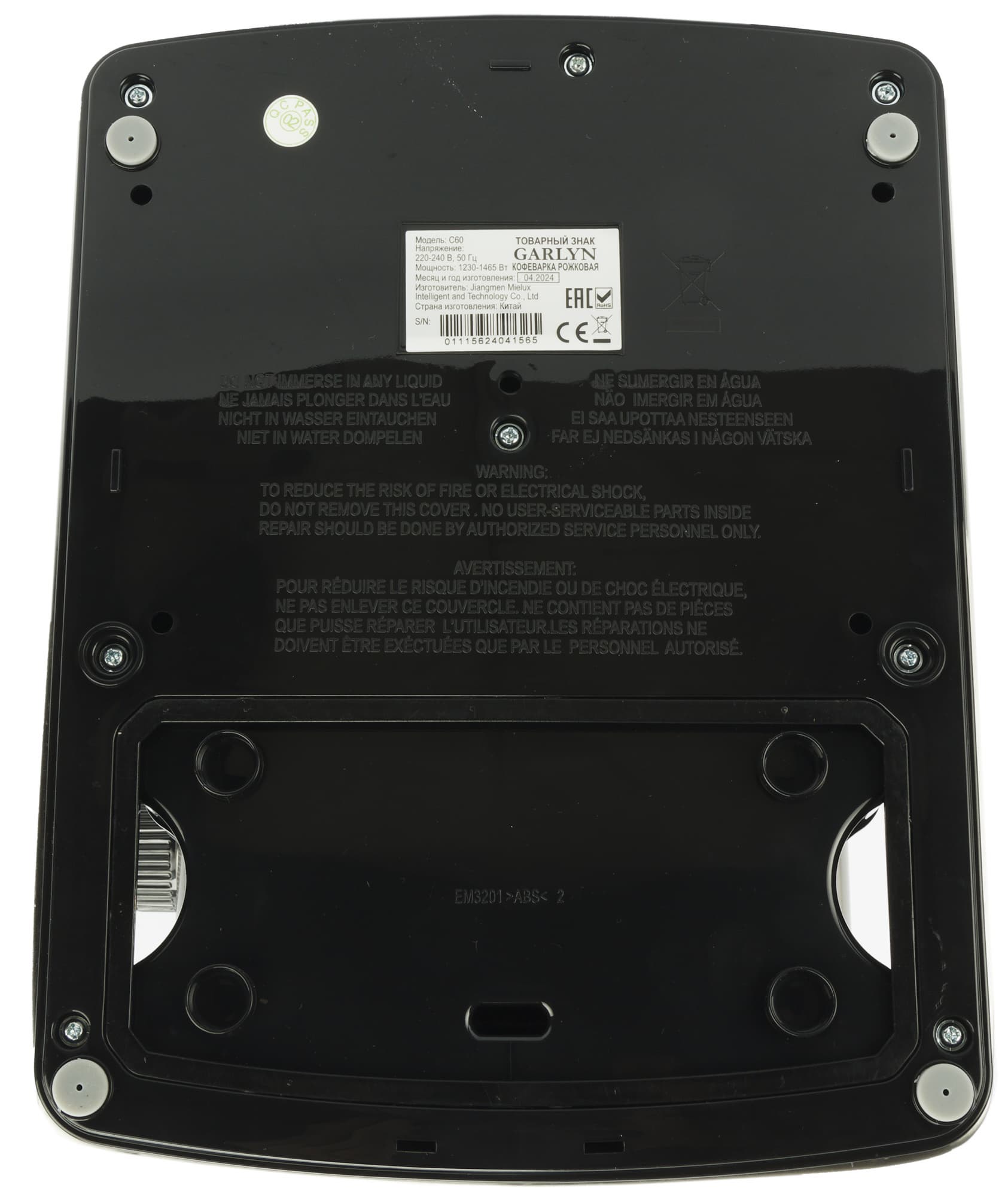 Кофеварка опирается на четыре круглые резиновые ножки, исключающие скольжение устройства по любой поверхности. На нижней стороне также можно видеть резиновую пробку слива (она пригодится при подготовке к транспортировке или хранению) и шильдик с серийным номером и краткими техническими характеристиками.
