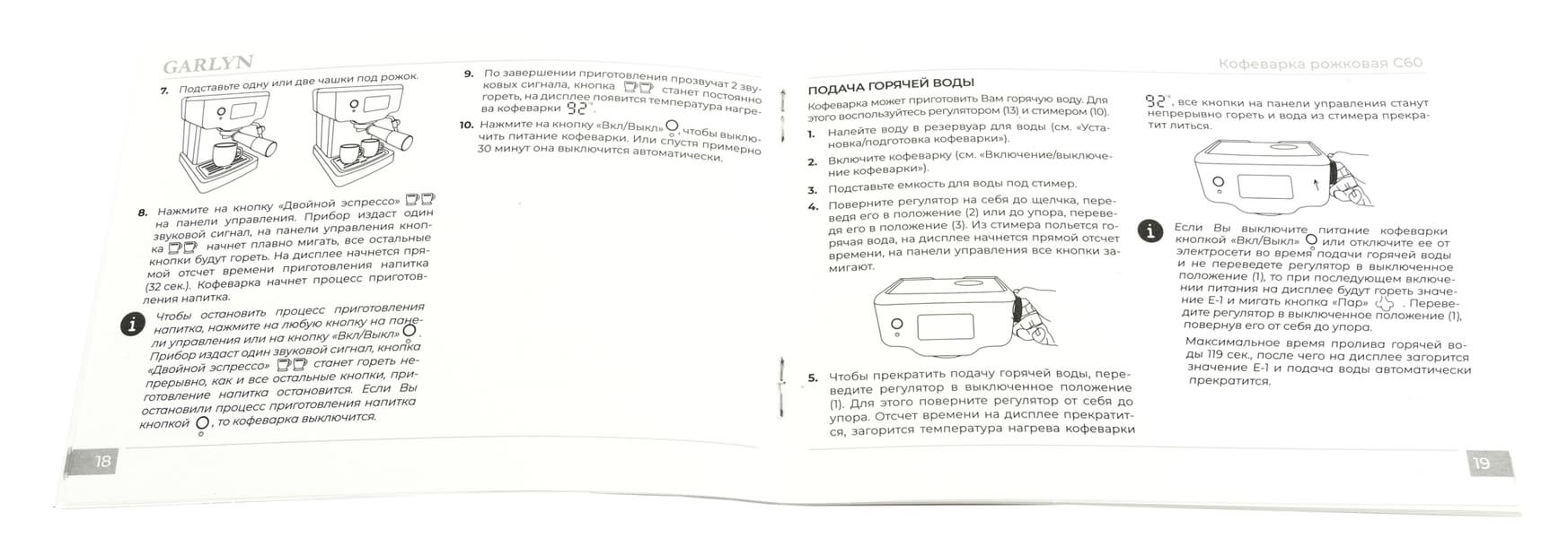 У кофеварки есть защита от перегрева. Если превысить максимальное время подачи горячей воды (119 секунд), сработает блокировка, подача прекратится, а на дисплее отобразится сообщение об ошибке («E-1»).